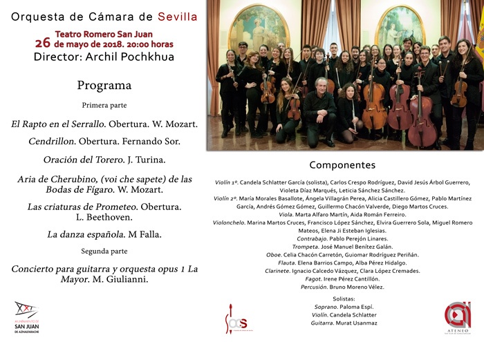 Para el concierto organizado por el Ateneo de San Juan de Aznalfarache, la OCS ha preparado un repertorio de gran calidad. El concierto tendrá dos partes, en la primera interpretarán obras de Mozart, Obertura de El Rapto en el Serrallo; Fernando Sor, Obertura de Cendrillon; Turina, Oración del Torero; Beethoven, Obertura de Las Criaturas de Prometeo y M. Falla, La danza española. La Soprano Paloma Espí interpretará junto a la orquesta el Aria de Cherubino (Voi che sapete), de las Bodas de Fígaro de W.A. Mozart.