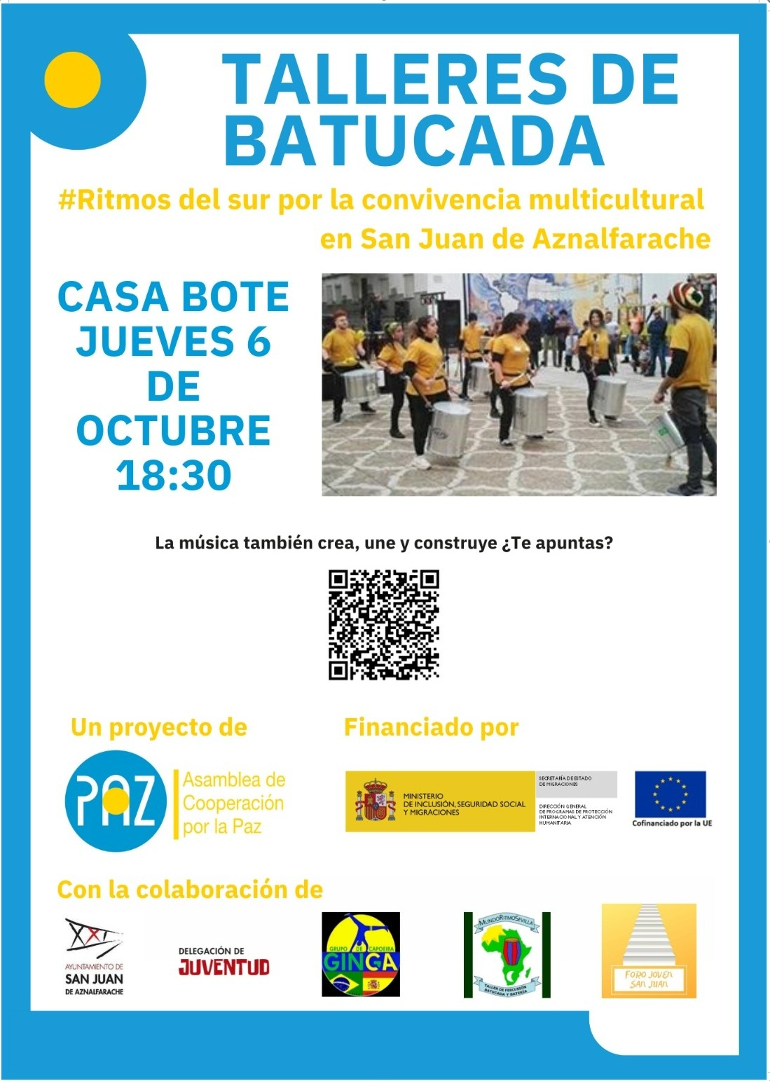 Asamblea de Cooperación por la Paz (ACPP) en colaboración con el Ayuntamiento de San Juan de Aznalfarache, grupo Cultural Ginga, Mundo Ritmos Sevilla y Foro Joven San Juan organiza esta actividad que se enmarca dentro del proyecto "Municipios sin Racismo, Pueblos por la Inclusión fase VII" un proyecto de ACPP, con la financiación del Ministerio de Inclusión, Seguridad Social y Migraciones (MISSM) a través del Fondo de Asilo, Migraciones e Integración (FAMI) de la Unión Europea (UE).