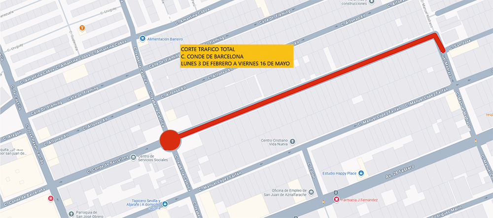 Emasesa va a realizar trabajos de mantenimiento y explotación de la red y acometidas en la Calle Conde de Barcelona a partir de lunes 3 de febrero. La ejecución de estos trabajos supondrá una apertura de la red general y por tanto el corte total de la calles hasta la finalización de los trabajos, prevista inicialmente para el 16 de mayo de 2025.
