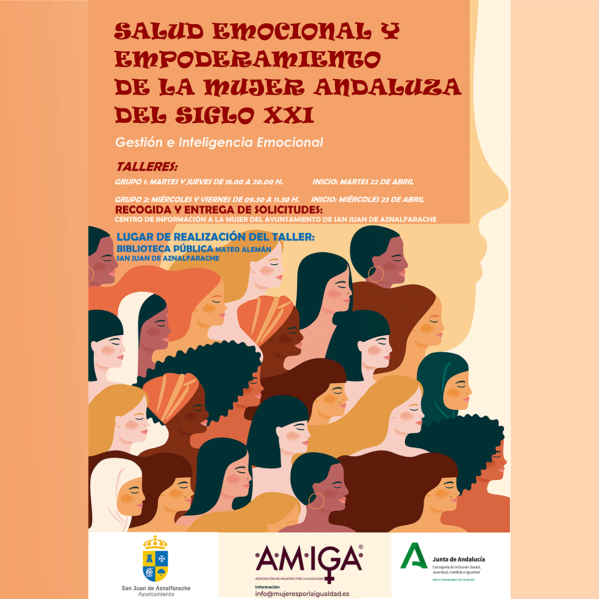 La delegación de Igualdad del Ayuntamiento de San Juan de Aznalfarache ofrece la posibilidad de participar en un taller dirigido a mejorar la salud emocional de las mujeres, una posiblidad de aprender a gestionar y mejorar la inteligencia emocional. El taller se ha organizado en dos grupos, con distintos horarios para facilitar así la participación a todas las mujeres que lo deseen.