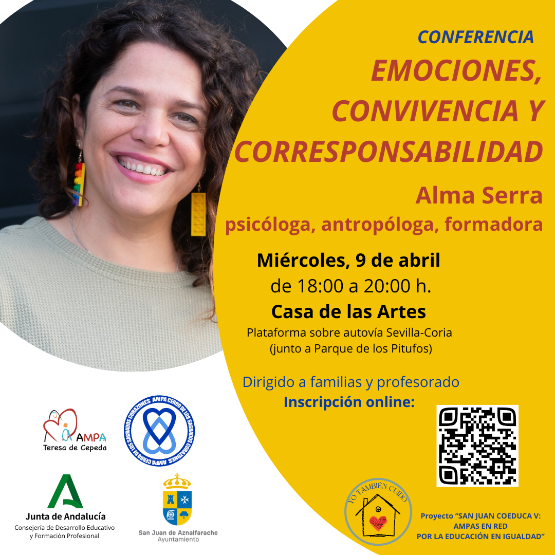La psicóloga Alma Serra, ofrecerá una conferencia con el título "Emociones, convivencia y corresponsabilidad". Será el 9 de abril en la Casa de las Artes a las 18:00 horas. Alma Serra es directora y fundadora del Centro de Psicología Humanista de Sevilla, Diplomada en Educacion Musical y Antropóloga, además de divulgadora a través de sus talleres, conferencia y de sus redes sociales, en las que acumula miles de seguidores. Esta actividad está dirigida a padres, madres y profesorado.