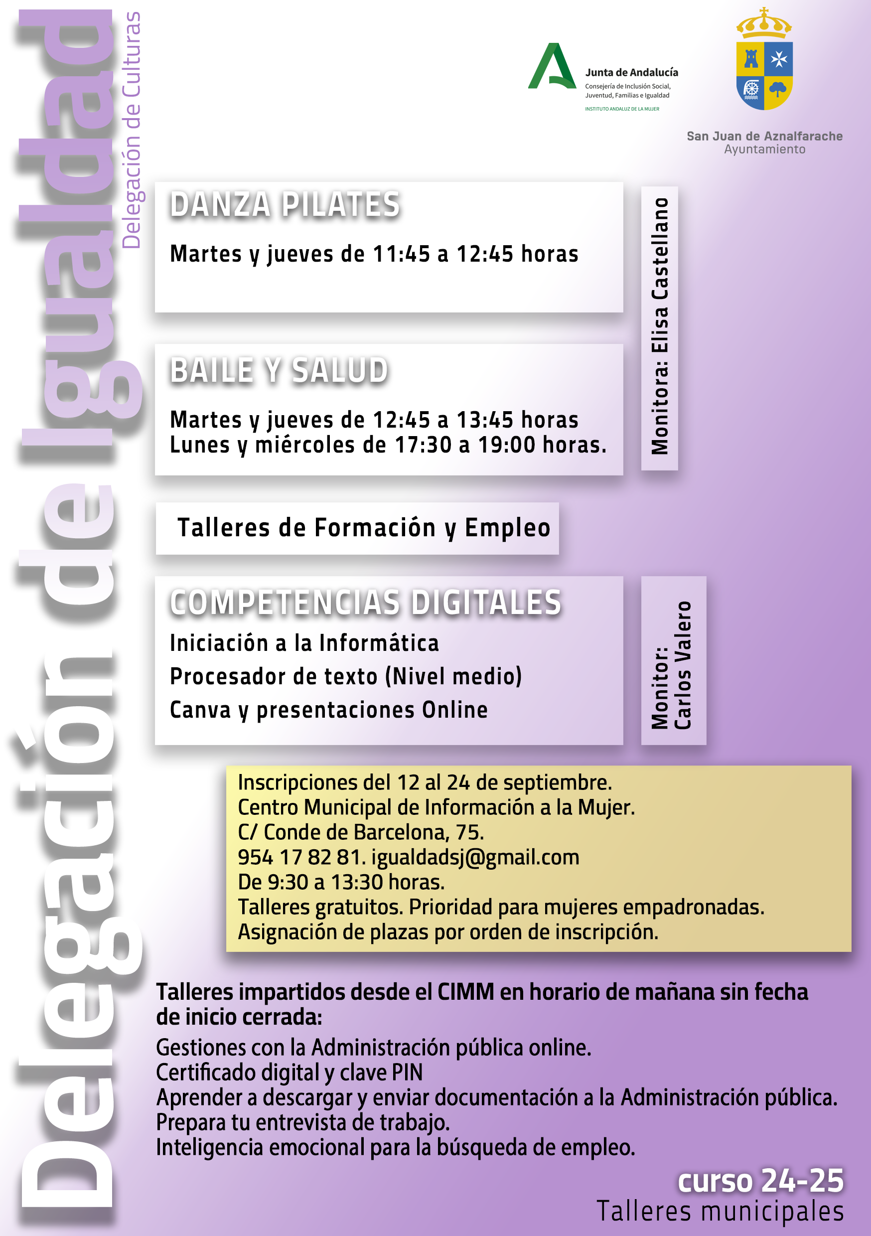 El jueves 12 de septiembre abrimos el plazo de inscripción para participar en los talleres municipales que organiza la delegación de Igualdad durante el curso 2024-2025. Podéis presentar vuestra solicitud hasta el 24 de septiembre. Os adjuntamos un enlace para que podáis consultar toda la información sobre nuestra oferta de talleres. A través de este enlace también podéis descargar las solicitudes para cada taller.