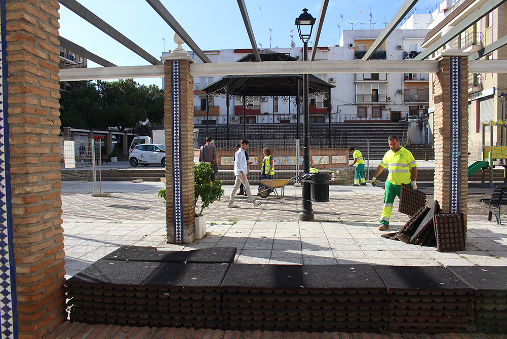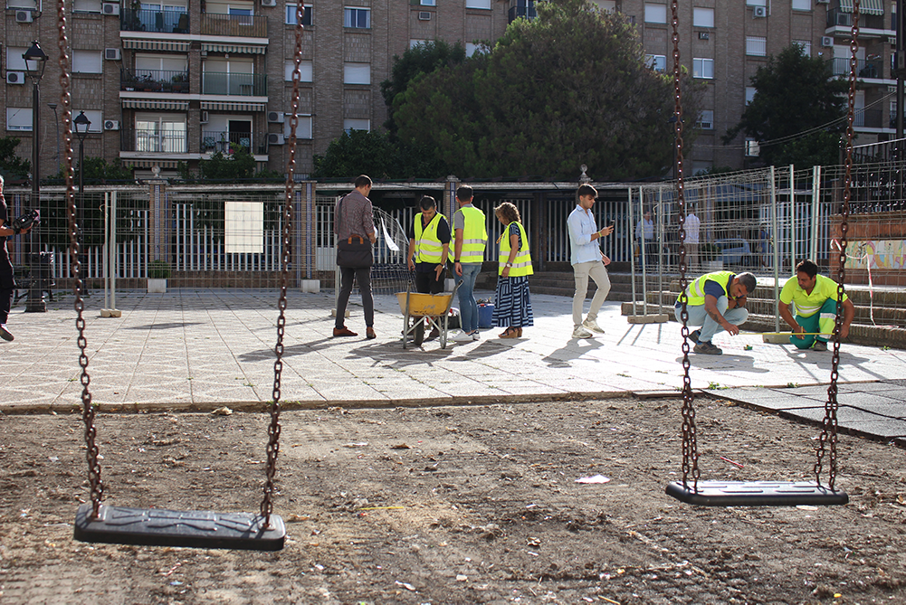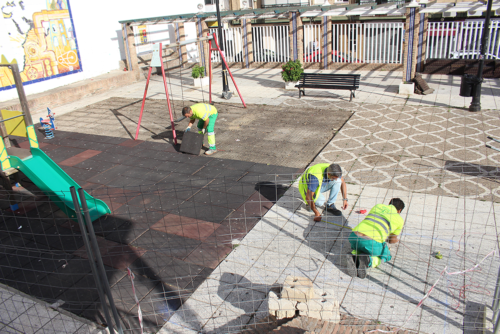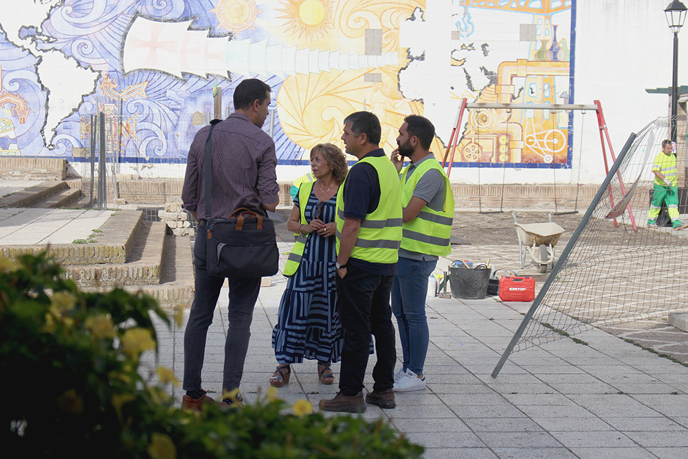 Una plaza más habitable, más accesible a los sanjuaneros y sanjuaneras. Ese es el objetivo de las obras de mejora que se han iniciado el lunes 8 de julio con la retirada del suelo de la zona de juegos infantil y la toma de medidas para la instalación de los pilares que sujetarán un gran toldo que dará sombra en el espacio situado junto a los juegos. La alcaldesa de la localidad, María Luisa Moya, junto al delegado de Planificación Urbana, Carlos Leo, y el delegado de Infraestructuras, Carlos Navarrete, visitó la zona para conocer los pormenores de los trabajos en este primer día de actuación.