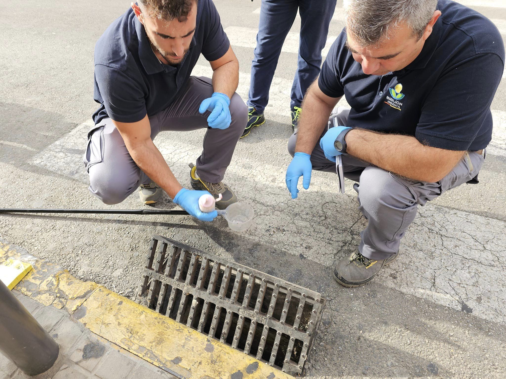Técnicos de la Junta de Andalucía, la empresa encargada de la gestión de plagas junto al delegado de Medio Ambiente, Ricardo Ruíz, están actuando en estos días ampliando las áreas de actuación revisando todos los imbornales.