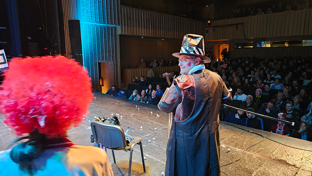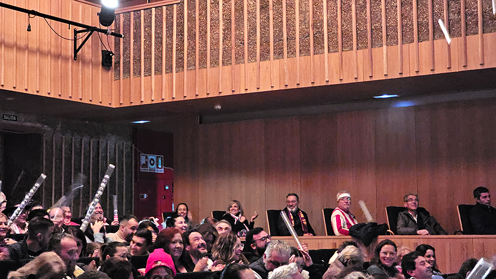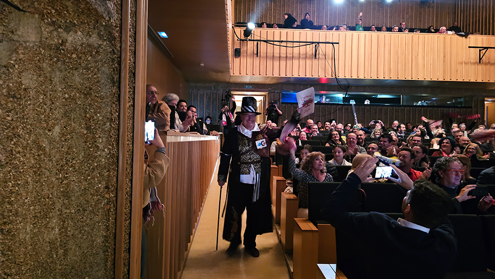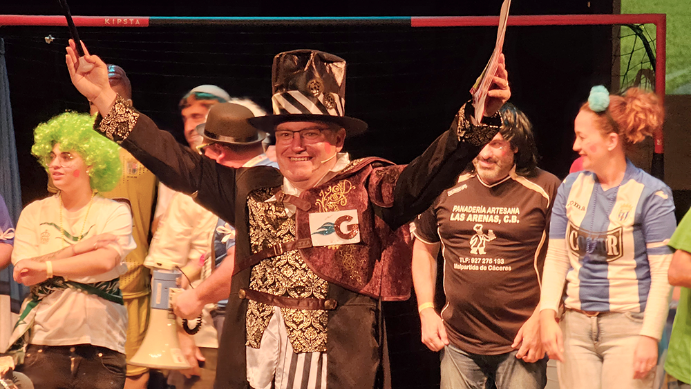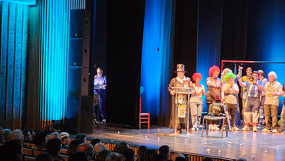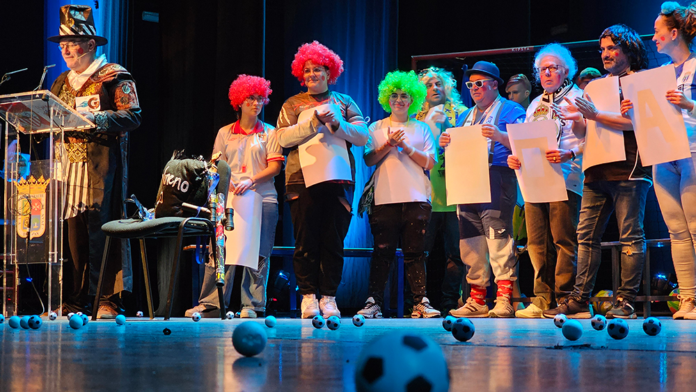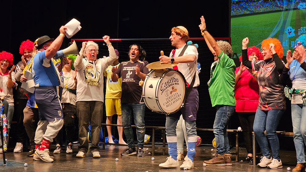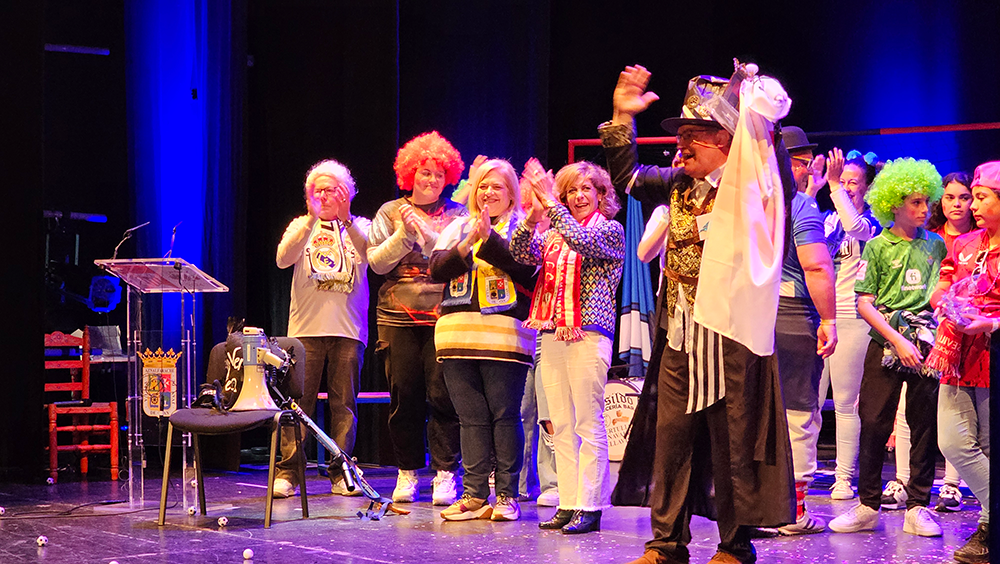 Un escenario futbolero, un tipo de jefe de los ultras del Carnaval, muy chirigotero, y una afición rendida que no paró de corear al pregonero durante los aproximadamente 60 minutos que duró el acto. Durante ese tiempo, Manolo Carlos repasó sus iconos en el mundo del Carnaval, como Manolo Santander y su himno no oficial del Cádiz, que sonó en la voz de un carnavalero sanjuanero como "El Gata"; con Martínez Ares, al que hizo un guiño ya en el primer saludo sobre el escenario; o con Juan Carlos Aragón «y creo en la vida eterna de los Carnavales...», una pasión contagiada por María José, «detrás de una gran mujer, ahí estoy yo».
