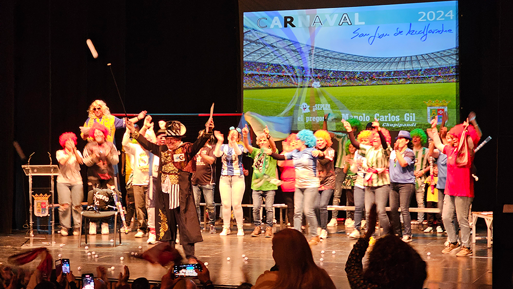 El periodista deportivo, Manolo Carlos Gil, desbordó el escenario del Romero San Juan con su alegría y con una propuesta de pregón original en la que el deporte se convirtió en auténtico protagonista de la noche. Acompañado de la "Chupipandi" repasó el mundo del deporte sanjuanero y su relación con San Juan de Aznalfarache desde su llegada a Radio Guadalquivir hace más de 30 años. Antes del inicio del pregón, la delegada de Fiestas Mayores, Rocío Amado, el presidente de la Asociación de Amigos del Carnaval, Javier Pérez y la alcaldesa, María Luisa Moya, entregaron el premio del concurso escolar del cartel anunciador del Carnaval a Cristina Suárez.
