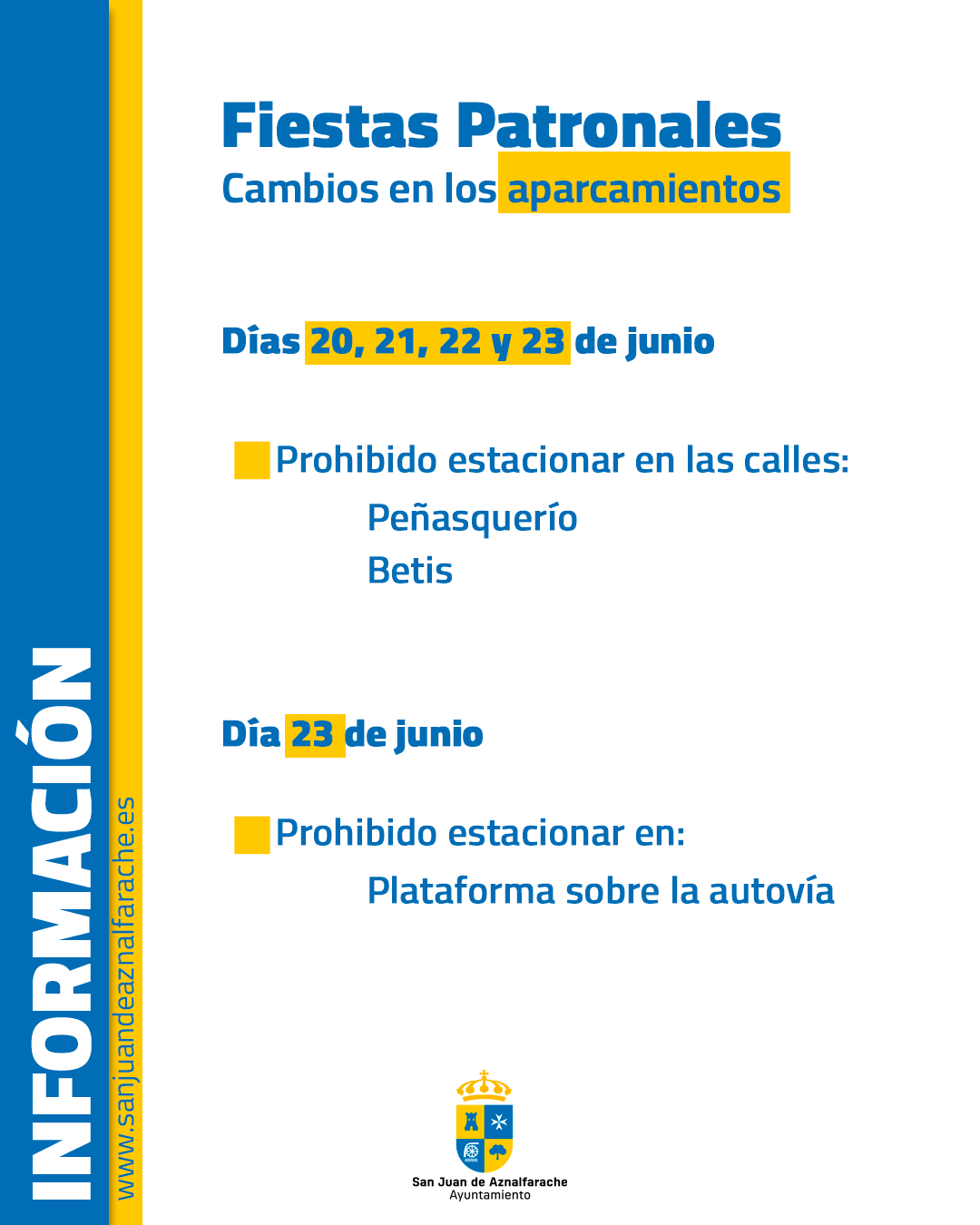 Por otra parte, las delegación de Tráfico y Seguridad Ciudadana y Fiestas Mayores han diseñado un Plan de Tráfico que estará en vigor durante los días en los que se celebrarán las Fiestas Patonales. Estará prohibido el aparcamiento en las calles Betis y Peñasquerío durante estos días, con el objeto de disponer vías de evacuación suficientes para garantizas el desarrollo seguro de las Fiestas Patronales. El día 23 estará prohibido estacionar en la Plataforma de Minas de Cala, donde se celebrarán las hogueras de la Noche de San Juan.