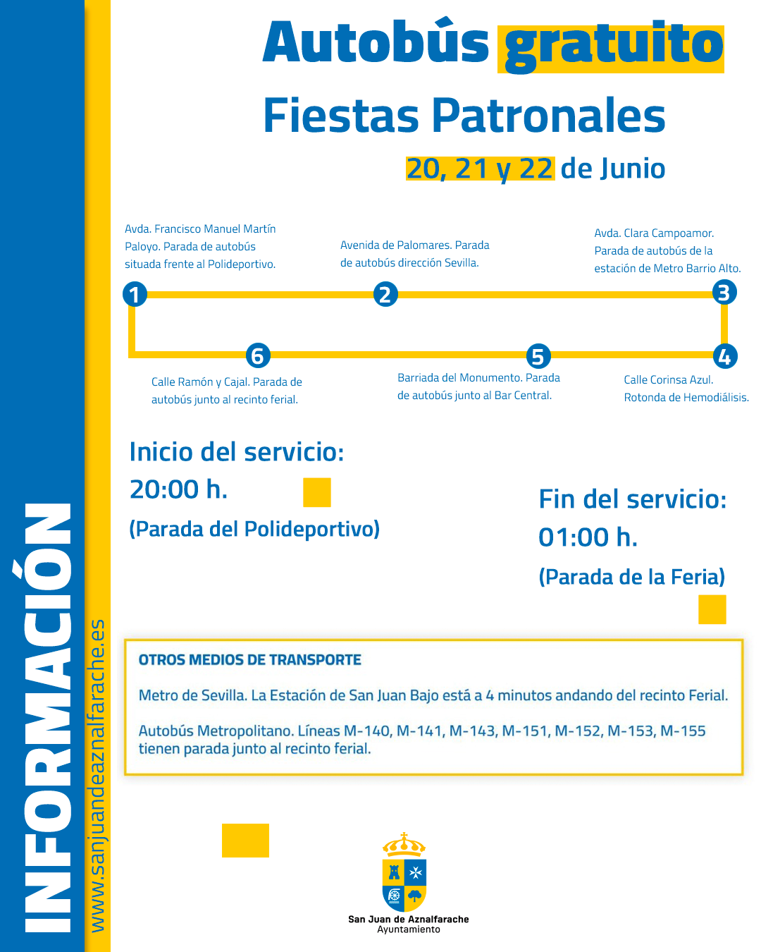 El Ayuntamiento ha dispuesto un servicio gratuito de autobús durante los días de las Fiestas Patronales. Estará en funcionamiento los días 20, 21 y 22 de junio de 20:00 a 1:00. La primera salida será a las 20:00 desde la parada situada junto al Polideportivo 1º de mayo y el último viaje de vuelta será a la 1:00 desde la gasolinera situada junto al recinto de las Fiestas Patronales. El autobús municipal tendrá paradas en la Avenida de Palomares, en el Avenida Clara Campoamor (junto a la estación del Metro), en la calle Cornisa Azul, glorieta de hemodiálisis y en la barriada del Monumento, junto al Bar Central.