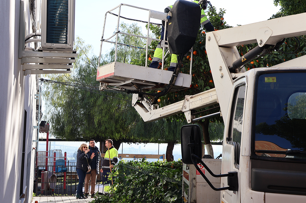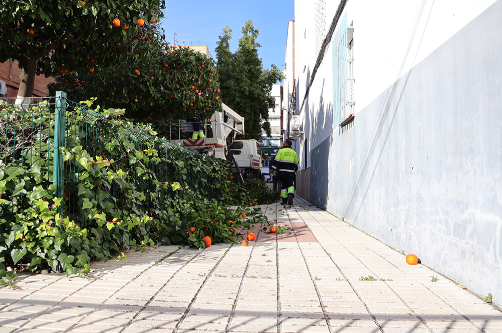 Los trabajos se realizan con el apoyo de maquinaria que se adapta a las necesidades y las posibilidades de cada espacio. En la calle Francisco Martínez Martín se ha actuado tanto a nivel del terreno como con la ayuda de un camión dotado con pluma y cestillo. En otras zonas, como es el caso del parque Joaquín Rosillo, situado en el mirado de la Cooperativa, se ha podido actuar a mano directamente.