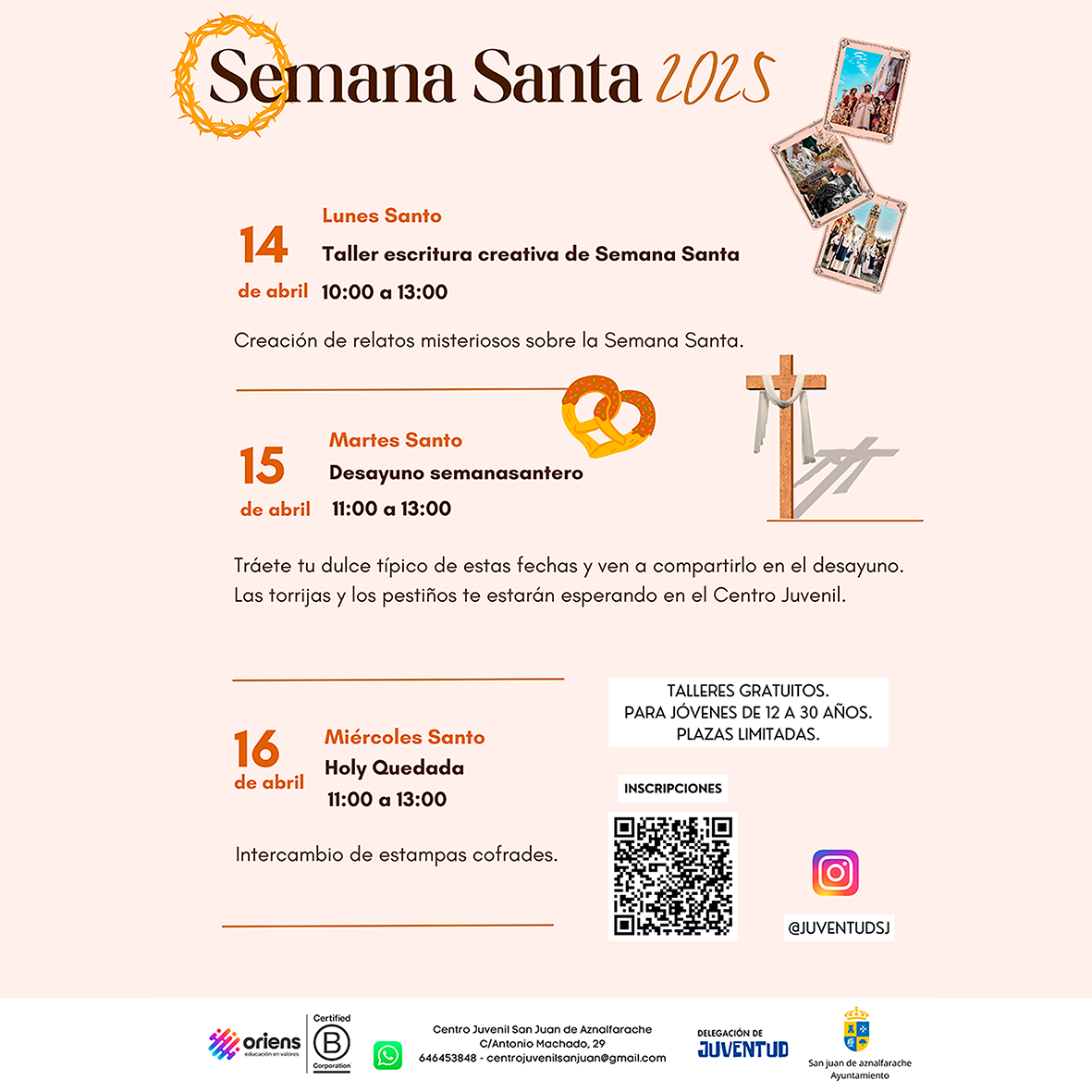 Tres propuestas relacionadas con la Semana Santa para la juventud sanjuanera. Tres talleres para llenar las mañanas del lunes, martes y miércoles de estos días de vacaciones escolares. Todas gratuitas y dirigidas a jóvenes de 12 a 30 años. Es necesario realizar la inscripción previamente ya que las plazas son limitadas. Los talleres se realizarán en el Centro Juvenil. Calle Antonio Machado, 29.