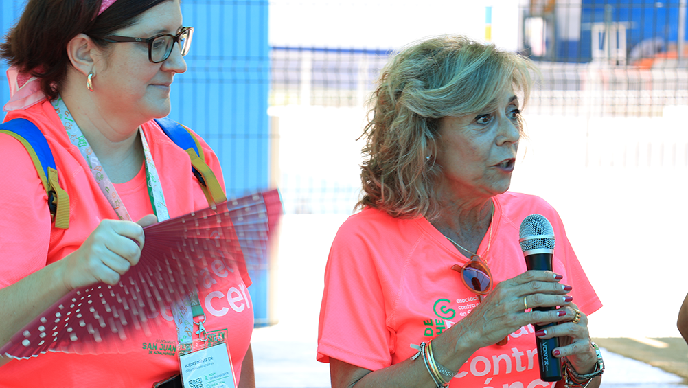 El punto final a la marcha, antes del inicio de la convivencia en el Polideportivo 1º de Mayo, lo puso la alcaldesa de San Juan de Aznalfarache, María Luisa Moya, quien agradeció el esfuerzo realizado a los miembros de la organización de esta marcha, a los muchos voluntarios y voluntarias que hicieron posible el desarrollo de la misma y al tiempo animó a las mujeres que padecen cáncer de mama a continuar con fuerza su batalla contra la enfermedad.