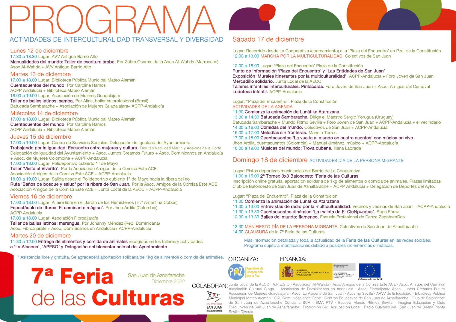 La 7ª Feria de las Culturas, que tiene lugar del 12 al 18 de diciembre en San Juan de Aznalfarache, incluye en su programación actividades culturales, lúdicas y deportivas, destacando su carácter participativo y demostrando el fortalecimiento de la sociedad civil organizada del municipio sevillano. El fin de semana se celebrarán numerosas actividades en la localidad y el domingo 18 de diciembre, coincidiendo con el Día de las Personas Migrantes, se leerá el manifiesto por los colectivos.