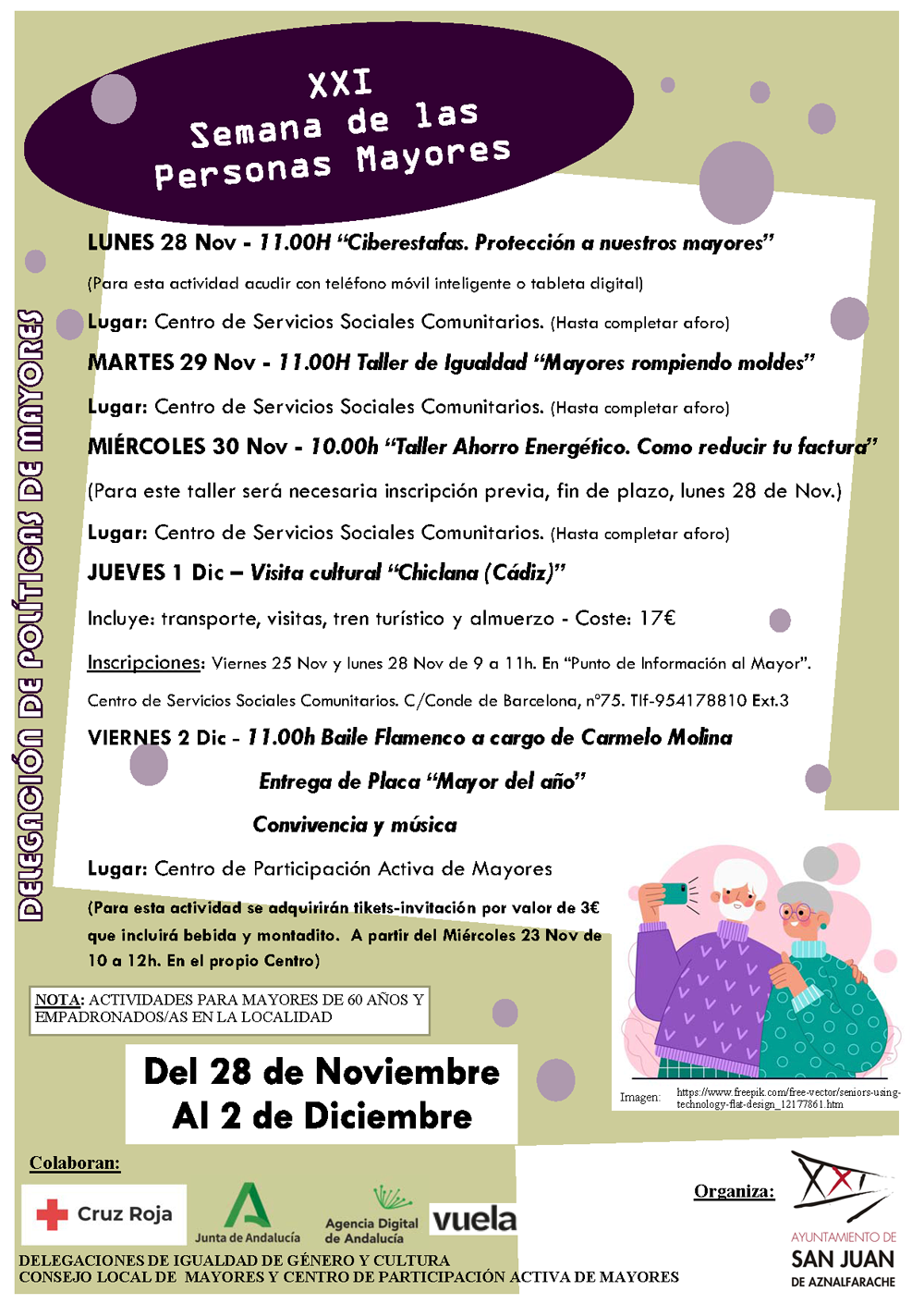 La programación que la delegación de Políticas de Mayores ha preparado en 2022 para la celebración de la XXI Semana de los Mayores intenta dar respuesta a alguno de los asuntos que preocupan a este sector de la población y ante los que se sienten más indefensos. Las nuevas tecnologías y las estafas que surgen a través de estos medios; cómo hacer frente al incremento de las facturas energéticas; o la violencia de género en parejas mayores de 60 años.