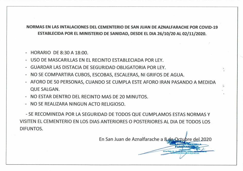 La Funeraria Santa María de la Estrella, empresa que gestiona el cementerio de la localidad, ha comunicado al Ayuntamiento de San Juan de Aznalfarache las normas que regirán las visitas al cementerio en los próximos días con motivo de las celebraciones de los días 1 y 2 de noviembre. Igualmente, han solicitado la colaboración de Protección Civil para controlar los acceso al Camposanto especialmente en los días en los que se espera mayor afluencia de público.