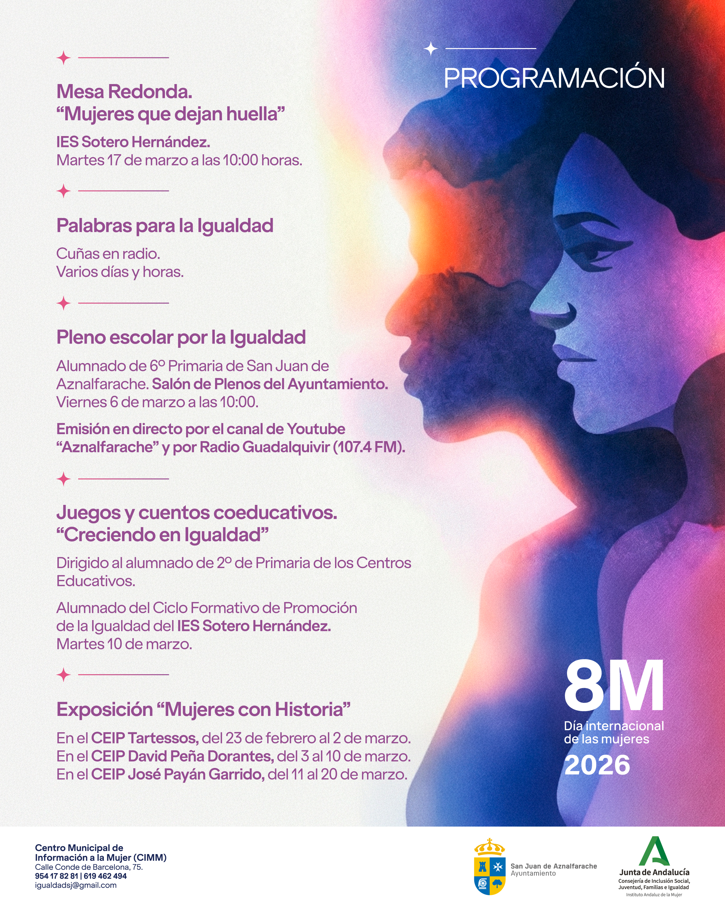 La mayor parte de la programación se desarrollará durante el mes de marzo, especialmente a partir del domingo 8, aunque ya el viernes 6 podremos conocer la opinión de nuestros jóvenes en el Pleno escolar por la Igualdad, que se emitirá en directo por Radio Guadalquivir y el canal de YouTube del Ayuntamiento.