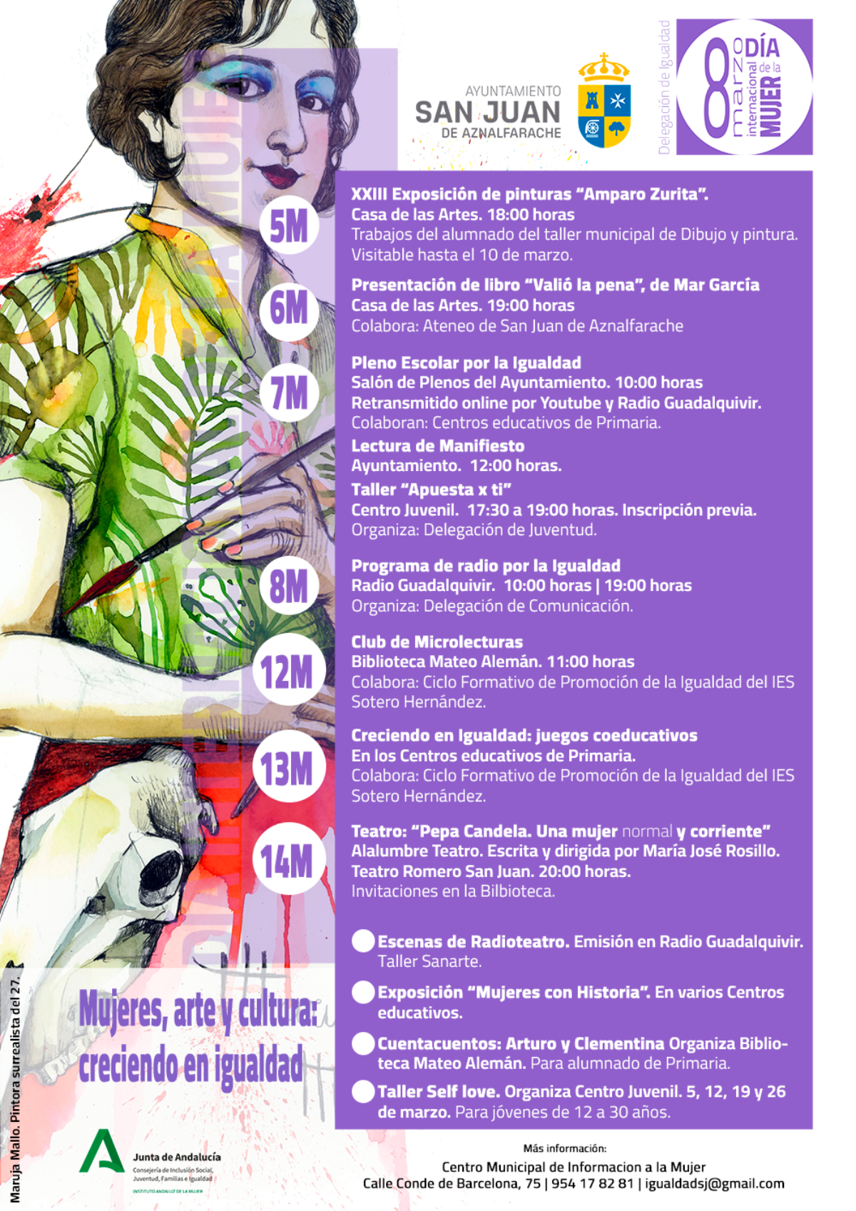 El Día Internacional de la Mujer nos permite visibilizar la necesidad de seguir trabajando para alcanzar la igualdad plena entre hombres y mujeres. Peso a los avances son muchas las diferencias y la mujeres deben salvar aún numerosos obstáculos que complican su acceso en igualdad de condiciones con los hombres. En 2025, la delegación de Igualdad del Ayuntamiento ha diseñado una programación de actividades que se centra en la importancia del arte y la cultura para seguir creciendo en igualdad.