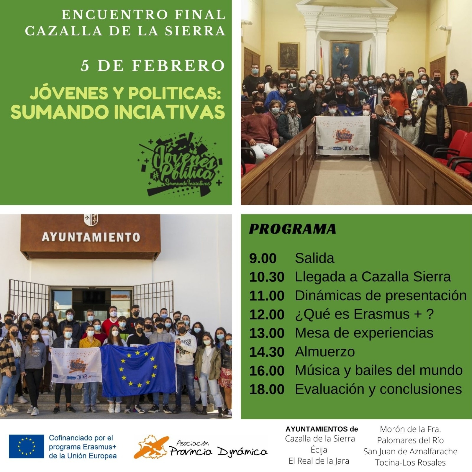 El sábado 5 de febrero se celebra en Cazalla de la Sierra el encuentro final del proyecto europeo "Jóvenes y Políticas: sumando iniciativas", que reunirá a más de 60 jóvenes de entre 17 y 30 años procedentes de todos los municipios que han participado en el programa. Desde San Juan partirá una delegación el sábado en la que además del concejal de Juventud, Juanma Santos, y la técnica del área, Inmaculada Brito, acudirán 11 jóvenes.