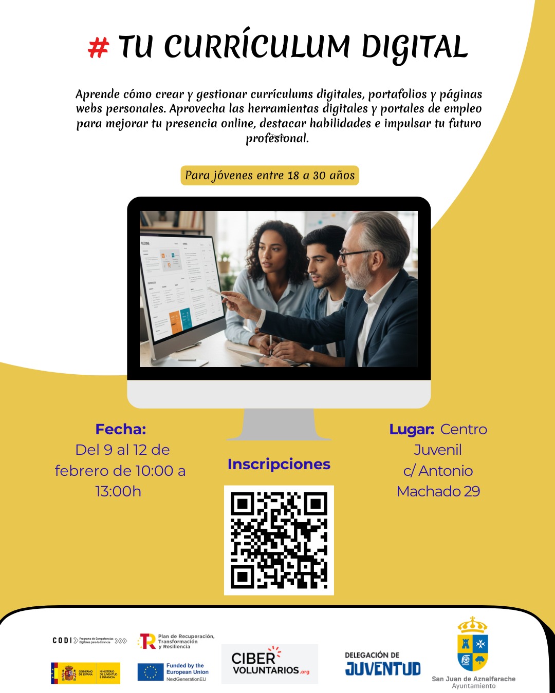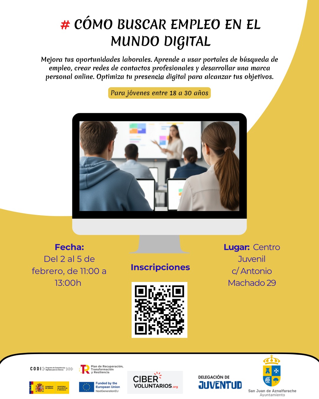 Mejora tus oportunidades laborales. Aprende a usar portales de búsqueda de empleo, crear redes de contactos profesionales y desarrollar una marca personal online. Optimiza tu presencia digital para alcanzar tus objetivos. Para jóvenes entre 18 y 30 años.