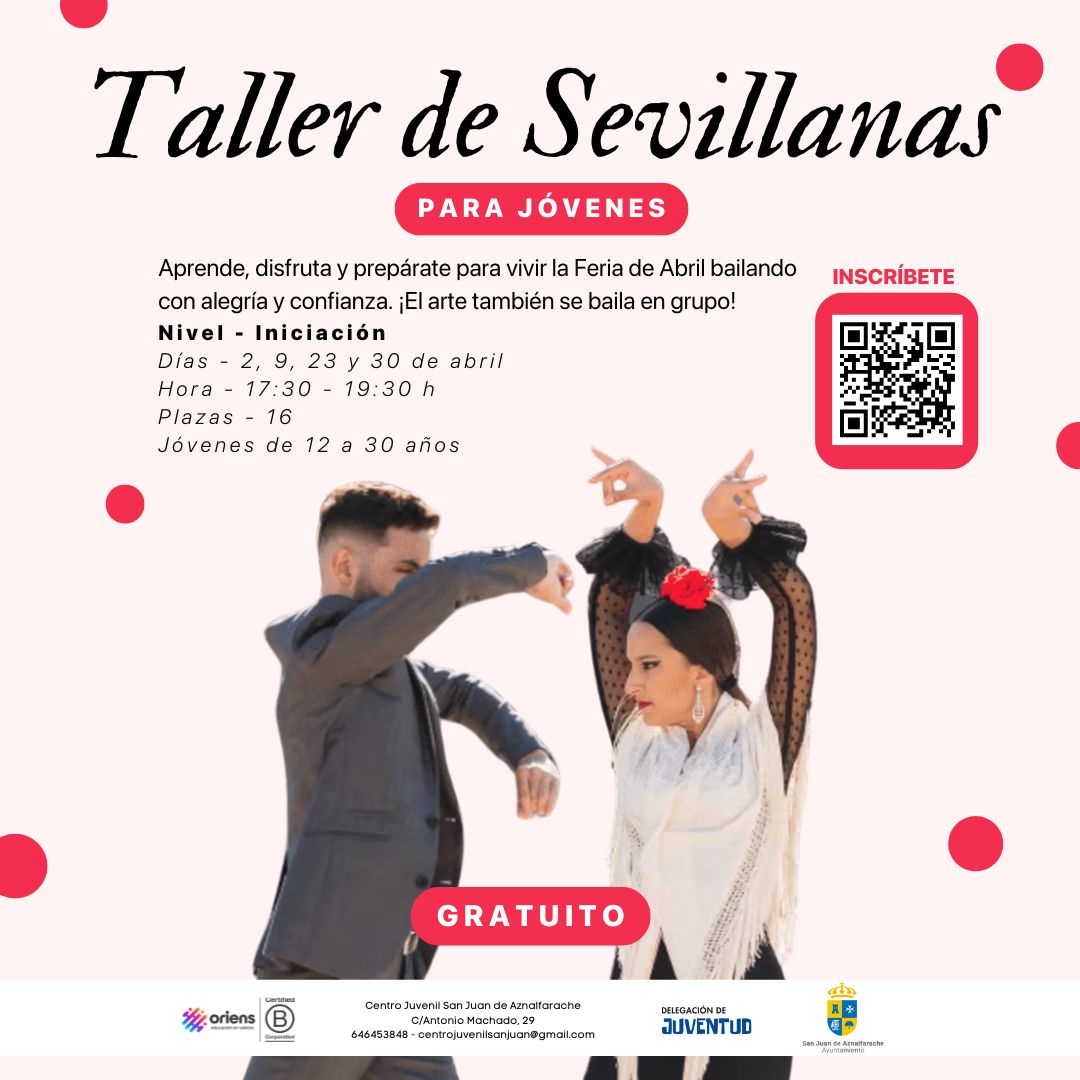 Te sumergirás en el arte y el compás de uno de los bailes más auténticos de nuestra tierra. Aprenderás paso a paso las sevillanas, desde el paseo hasta las vueltas. No importa si nunca has bailado antes, este taller está pensado para que descubras la magia del baile y te prepares para lucirte en la feria en la Feria de Abril.