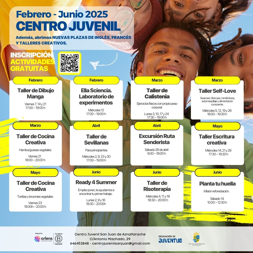 El Centro de Juvenil sigue abierto todos los días de la semana con propuestas diseñadas a partir de las preferencias y las peticiones de nuestra juventud. En la temporada de invierno/primavera tendrá actividades de formación, arte, cuidado personal, deporte e incluso empleo. Revisa nuestras propuestas, elige la que mejor se adapte a tus preferencias (pueden ser varias) y aprovecha tu tiempo libre con nosotros. Inscríbete pronto que las plazas son limitadas en todas las actividades.