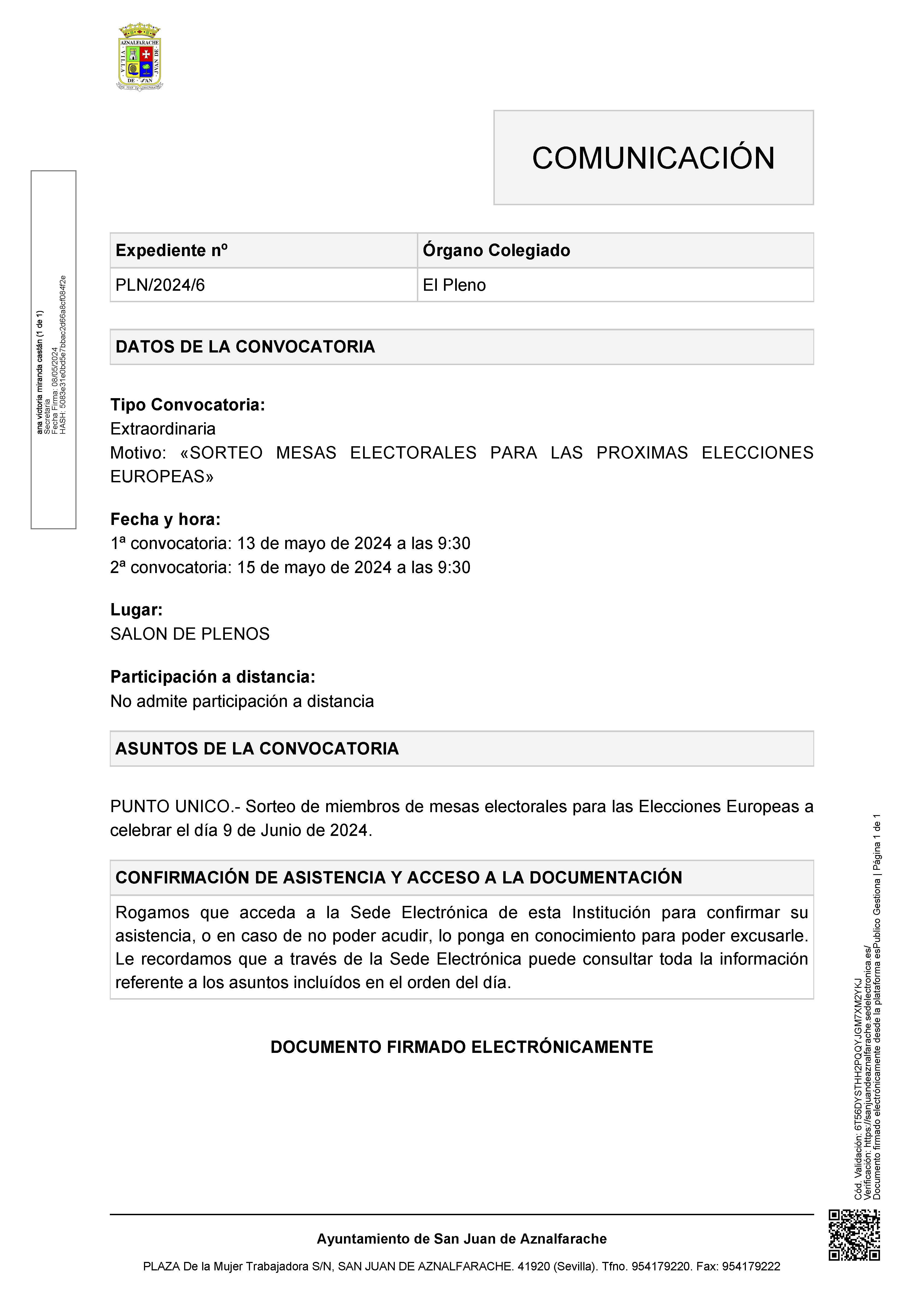 Convocatoria del pleno extraordinario 13 05 2024
