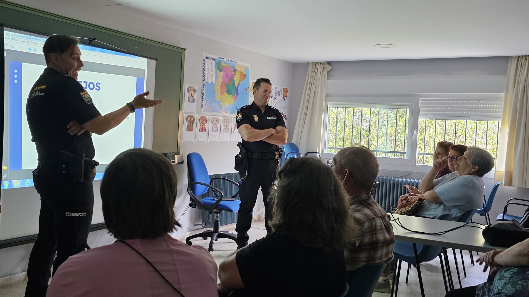 Agentes de la Policía Nacional imparten consejos sobre cómo actuar ante posibles “ciberestafas” en el Centro de Participación Activa de personas mayores.