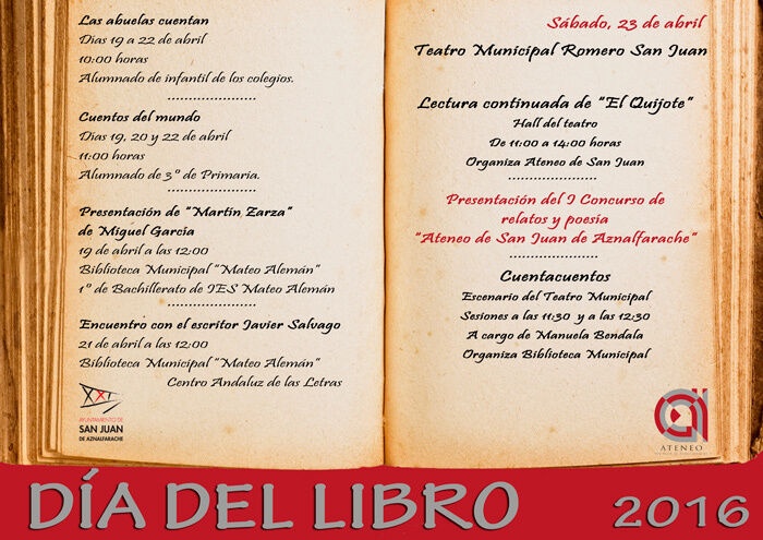 El Ayuntamiento de San Juan de Aznalfarache y el Ateneo de la localidad colaboran este año, por primera vez, en las actividades programadas con motivo de la celebración del Día del Libro el próximo 23 de abril. Este año, con motivo del cuarto de centenario de la muerte de Miguel de Cervantes se ha querido realizar un homenaje con una lectura continuada de El Quijote en el hall del teatro Romero San Juan.