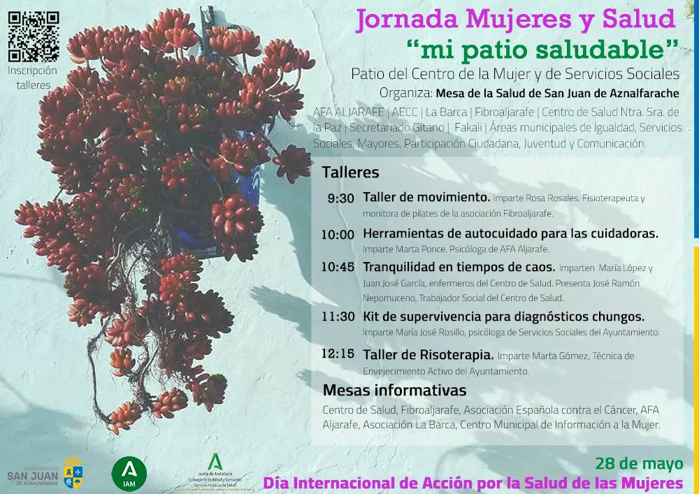 La Mesa de la Salud de San Juan de Aznalfarache organiza unas jornadas con motivo del Día Internacional de Acción por la Salud de las Mujeres, que se conmemora el 28 de mayo. El Ayuntamiento de San Juan de Aznalfarache, el Centro de Salud Nuestra Señora de la Paz y los colectivos ciudadanos que forman parte de la Mesa ofrecerán talleres y colocarán mesas informativas sobre sus actividades en el Patio del Centro de Municipal de Información a la Mujer y el Centro de Servicios Sociales el día 28. Para participar en los talleres se recomienda realizar la inscripción previamente.
