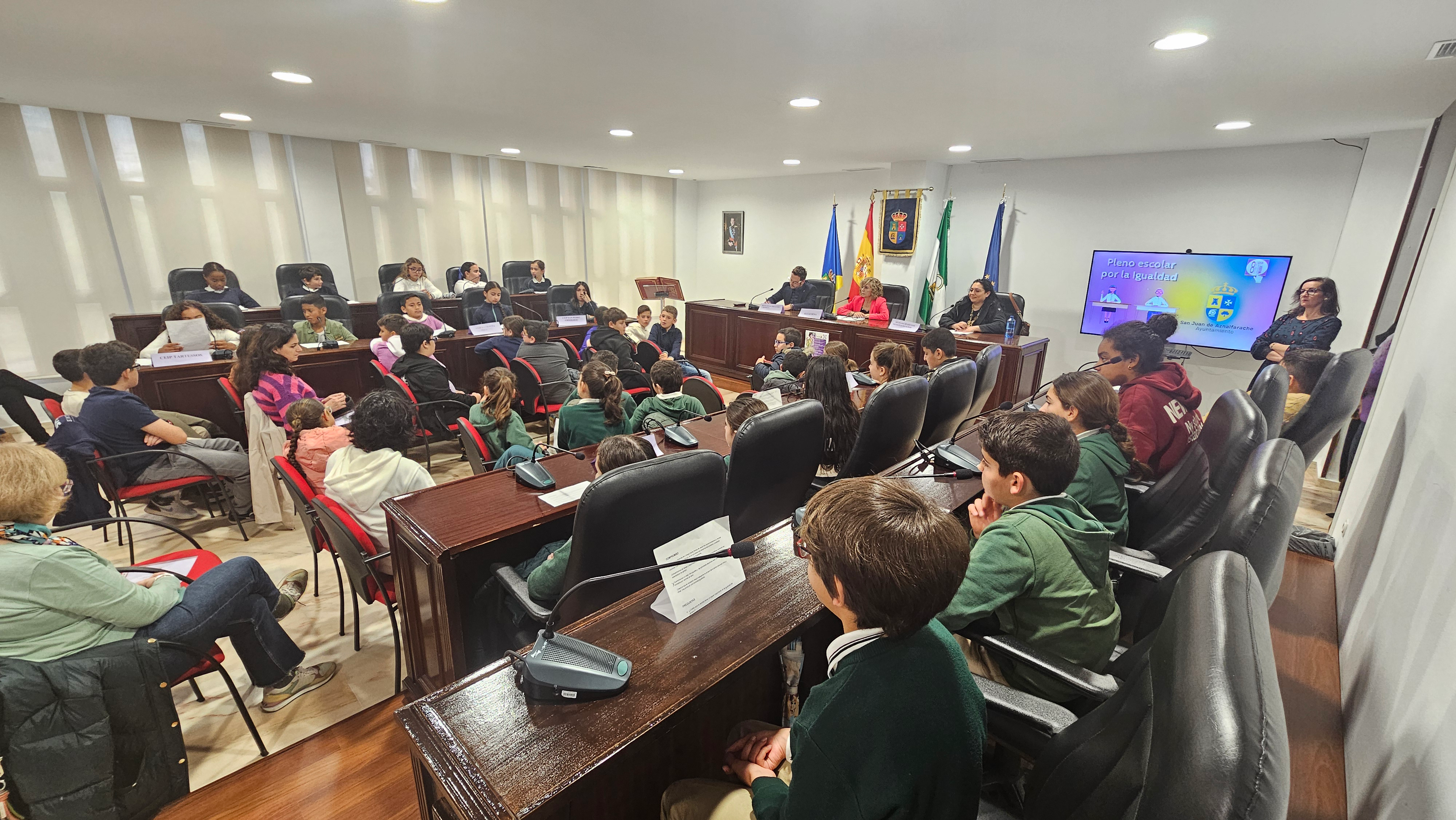 Cerca de 60 alumnos de 5º y 6º de Primaria de todos los colegios de San Juan han participado en este pleno especial con el que el Ayuntamiento y la comunidad educativa sanjuanera conmemora el Día Internacional de la Mujer. El delegado territorial de la consejería de Desarrollo Educativo, Miguel Ángel Araúz, ha presenciado los compromisos adquiridos en el Pleno Escolar por la Igualdad.