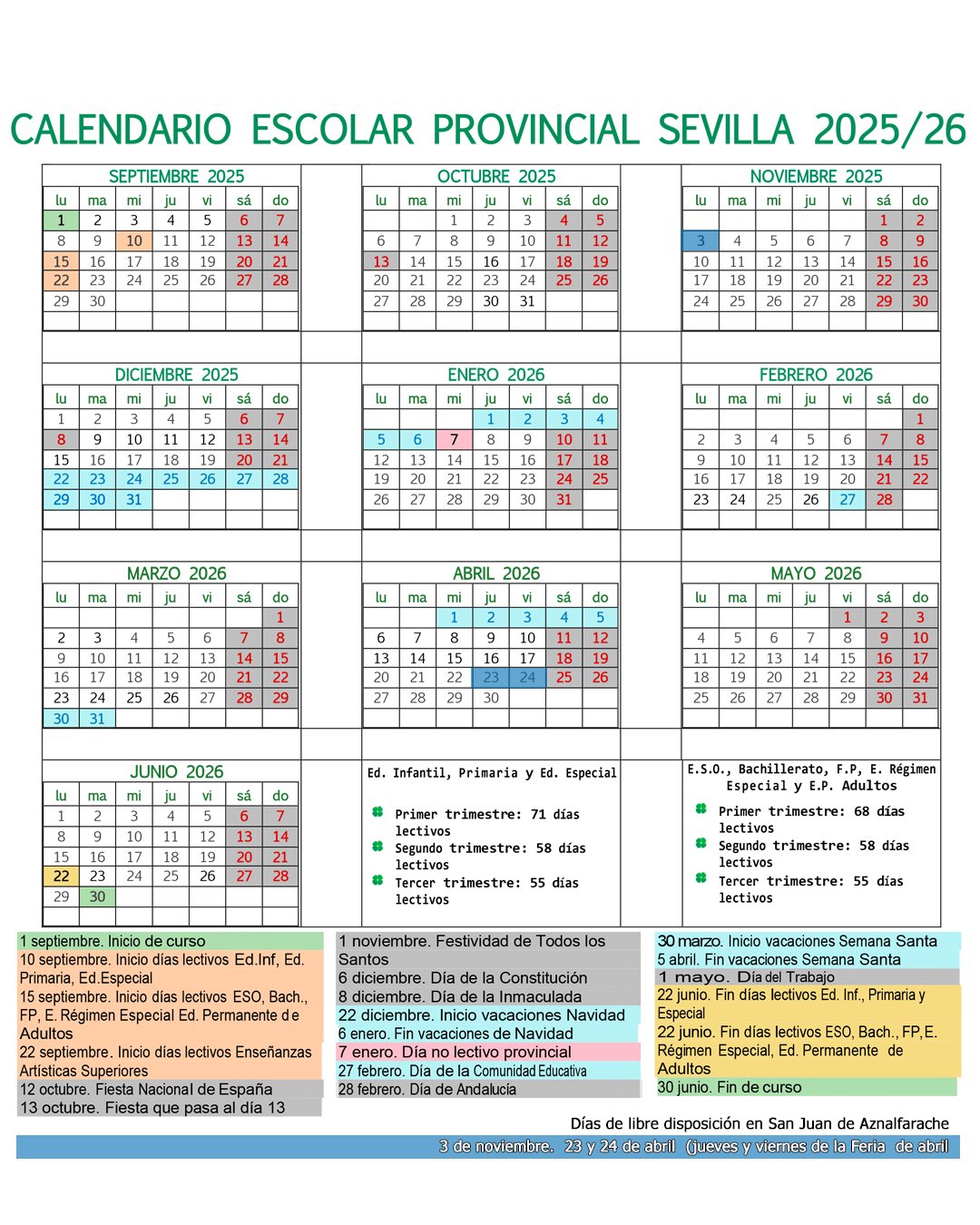 Los días no lectivos de la localidad, elegidos por el Consejo Escolar Municipal, son el 3 de noviembre y los días 23 y 24 de abril, jueves y viernes de la Feria de Sevilla.