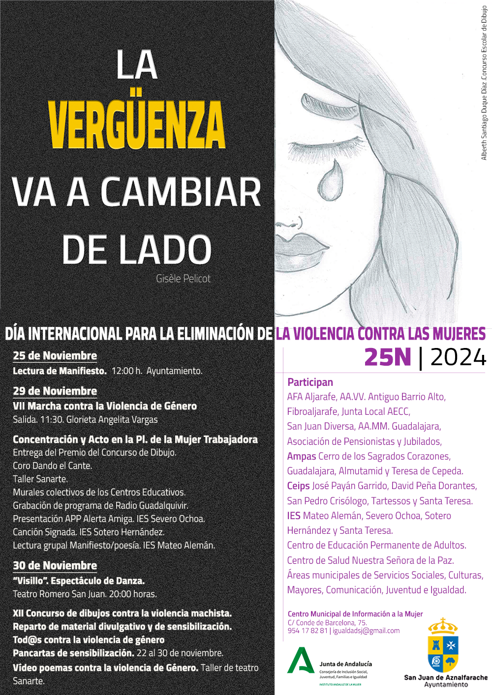 El 29 de noviembre se celebran los actos centrales de la campaña que el Ayuntamiento de San Juan de Anzalfarache ha organizado con motivo de la conmemoración del 25 de noviembre. La VII Marcha contra la Violencia de Género, en la que participan los centros de Secundaria de la localidad y la ciudadanía en general, partirá de la Glorieta Angelita Vargas a las 11:30 horas y concluirá en la Plaza de la Mujer Trabajadora.