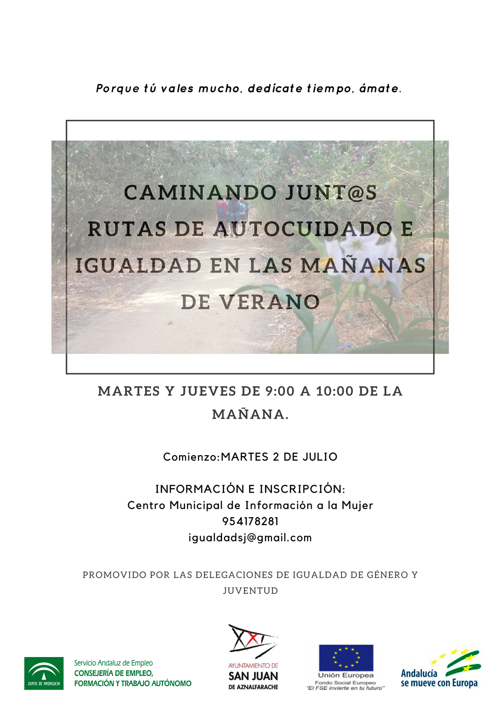Los martes y jueves de 9:00 a 10:00 de la mañana. Comenzamos el martes 2 de julio. Información e inscripción en el Centro Municipal de Información a la Mujer.