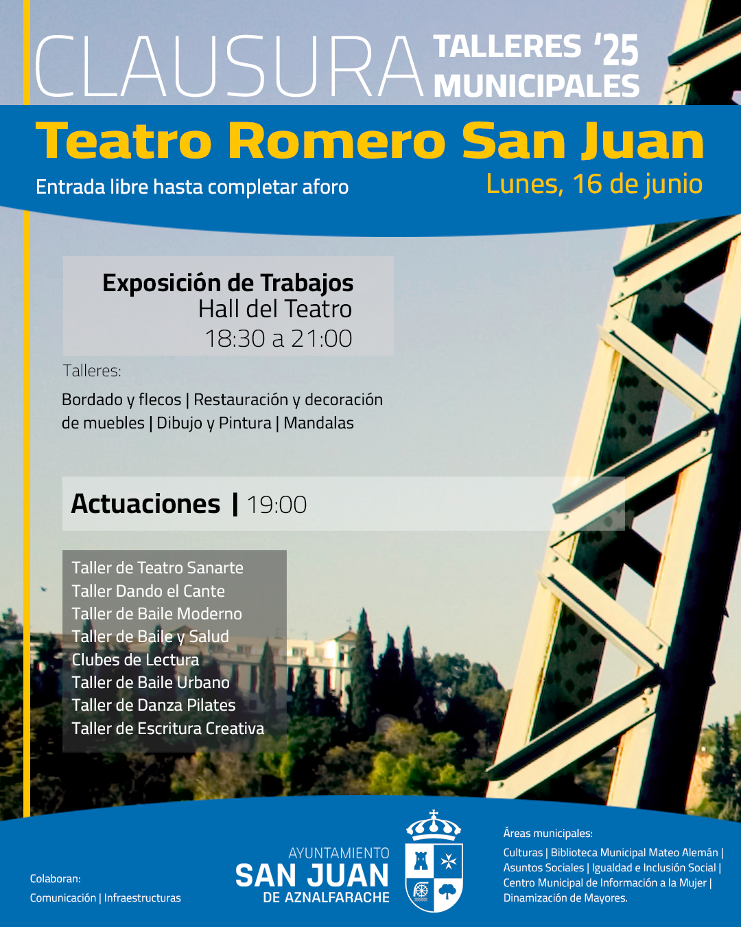El alumnado de los talleres de Bordado y flecos, Restauración y Decoración de muebles y objetos, Dibujo y Pintura, Mandalas ha preparado una muestra de los trabajos que han realizado durante todo el curso. Se podrá ver en el el Hall del Teatro Romero San Juan el mismo día de la Gala de Clausura, partir de las 18:30 horas y hasta la finalización del acto, aproximadamente a las 21:00 horas.