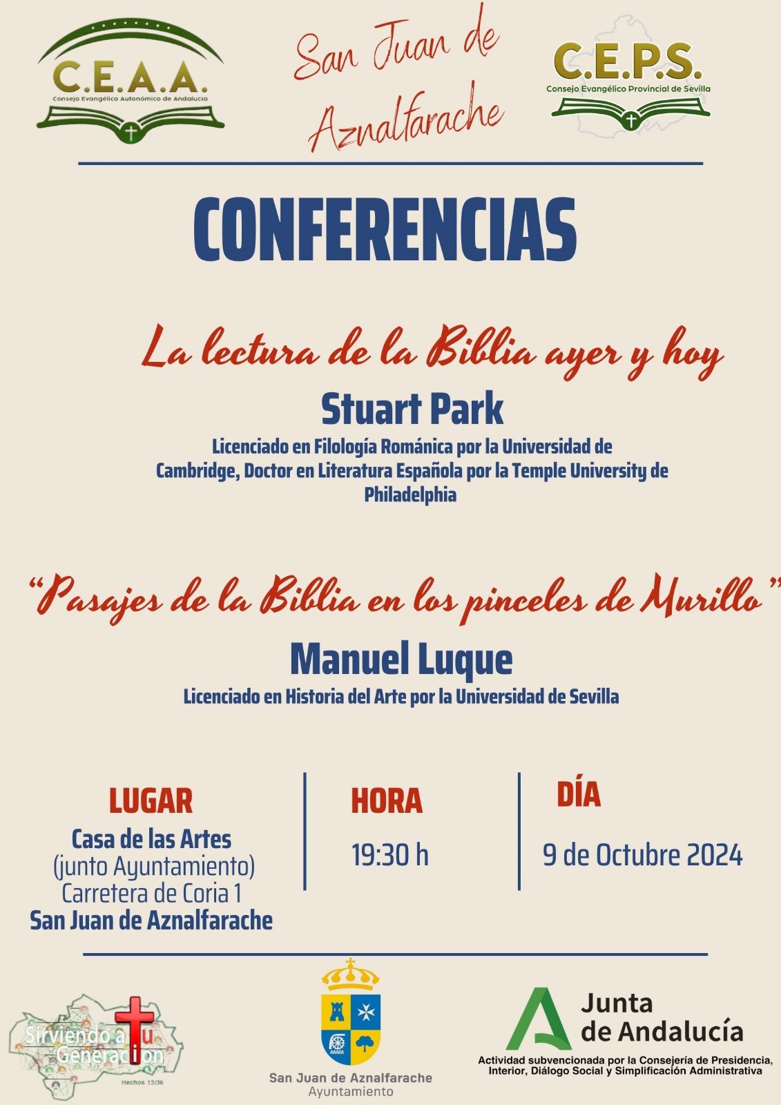 La jornada de Conferencia comenzará con la que pronunciará el filólogo románico Stuart Park titulada "Lectura de la Biblia ayer y hoy" y posteriormente será el Historiados del Artes, Manuel Luque quien hablé sobre "Pasajes de la Biblia en los pinceles de Murillo".