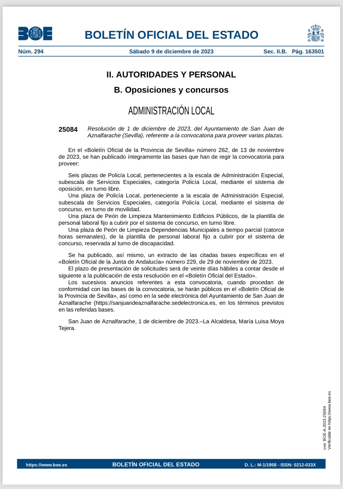 • Publicación de la convocatoria en el BOE nº. 291, de 9 de diciembre de 2023.