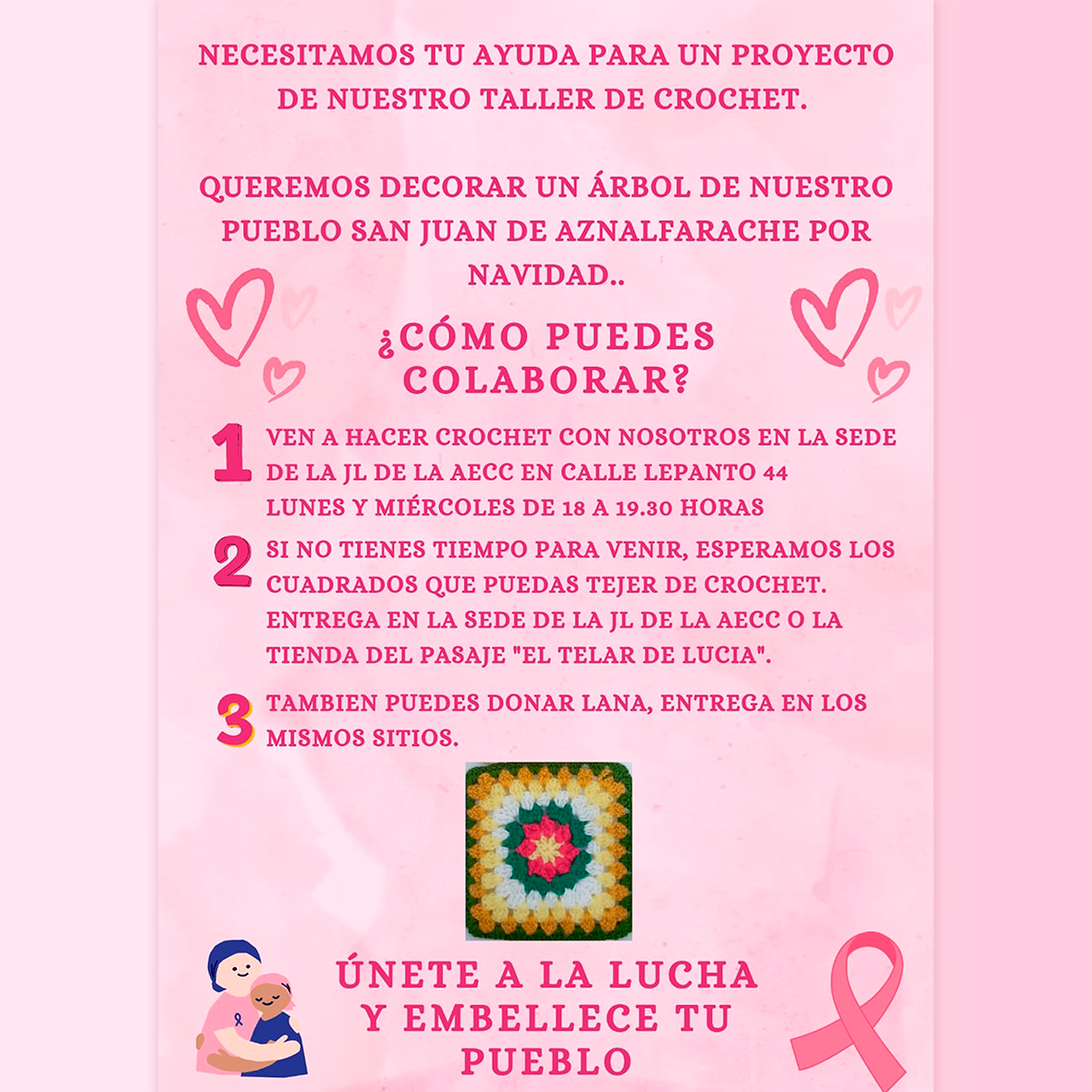 También se puede colaborar, para quienes no puedan acudir a la sede estos días, llevando cuadrados de crochet ya tejidos a la sede de la asociación o a "El Telar de Lucía". Igualmente, para quienes no sepan hacer crochet se ha creado la posiblidad de colaborar donando lana que se puede entregar en los mismos sitios.