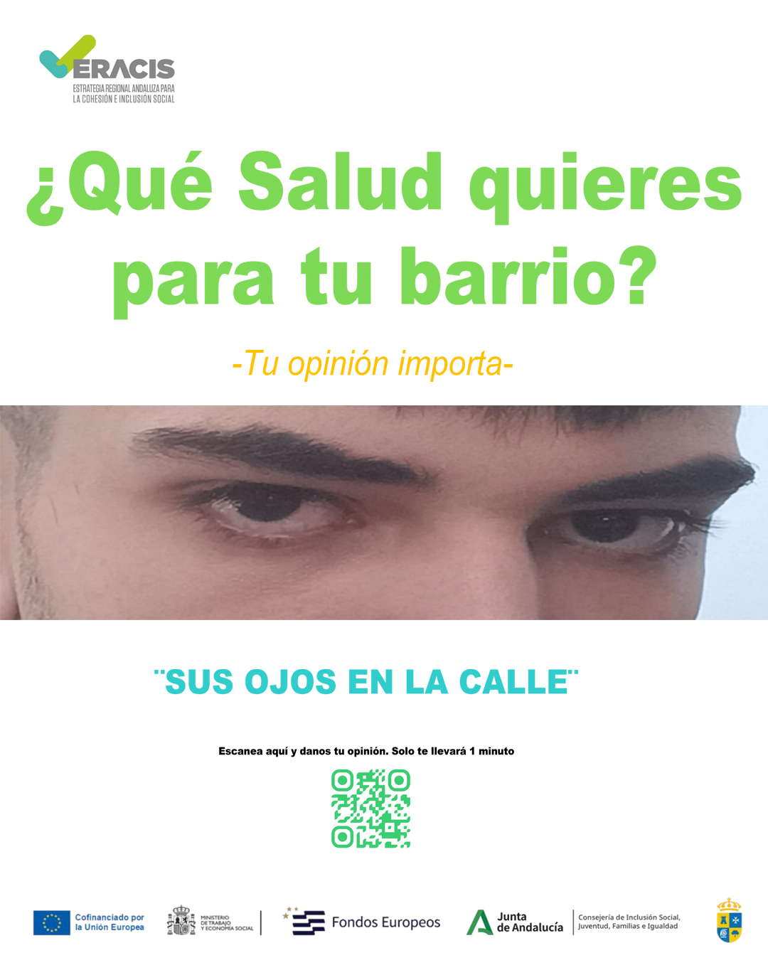 La actividad "Sus ojos en la calle" prentende recopilar las preocupación, necesidades y prioridades que tienen los vecinos y vecinas de San Juan de Aznalfarache en materia de salud. De esta manera se pretende que la ciudadanía sea la protagonista en la mejor de su bienes. La actividad está promovida por el proyecto Eracis+ en coordinación con agentes de salud, Ayuntamiento de San Juan de Aznalfarache y entidades ciudadanas, todos ellos integrados en la Mesa de Salud Municipal.