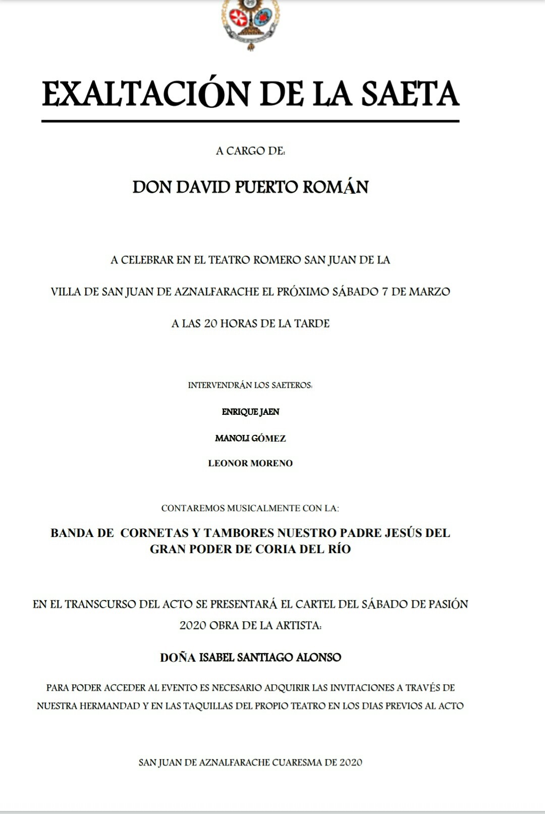 La hermandad sacramental de San Juan Bautista celebrará su tradicional «Exaltación a la Saeta» en el teatro municipal Romero San Juan a las 20:00 horas del sábado 7 de marzo. David Puerto Román será el encargo de pronunciar esta exaltación.