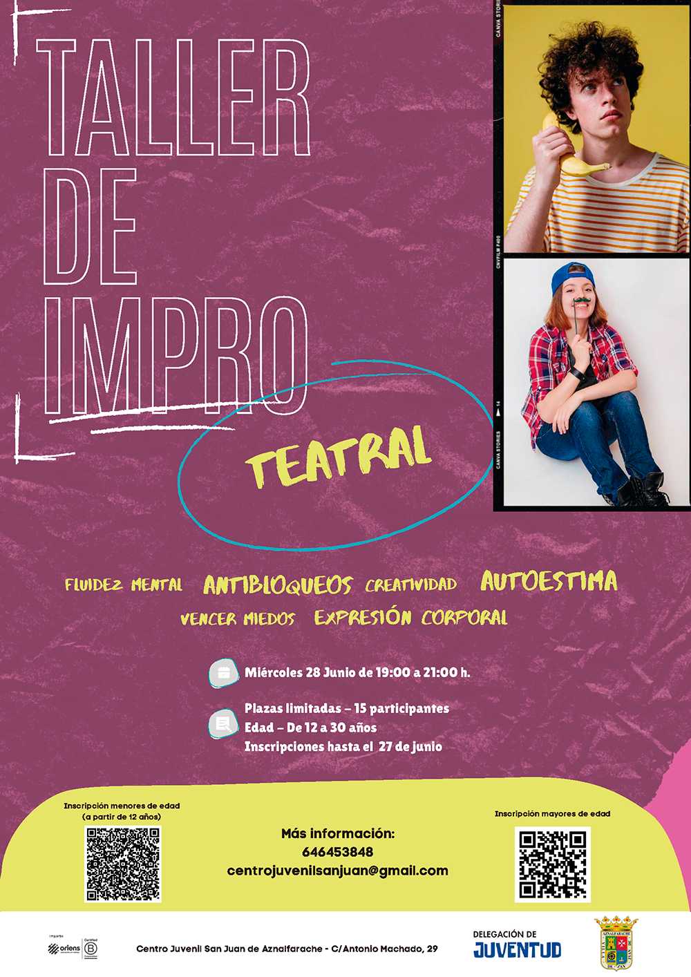 Fluidez mental, antibloqueos, creatividad, autoestima, expresión corporal son algunas de las herramientas que se van a trabajar en el taller de Impro que organiza la Delegación de Juventud del Ayuntamiento de San Juan de Aznalfarache el próximo miércoles 28 de junio. Serán en el Centro Juvenil entre las 19:00 y las 21:00 horas. El taller se dirige a jóvenes de entre 12 y 30 años aunque las plazas están limitadas a un máximo de 15 participantes.