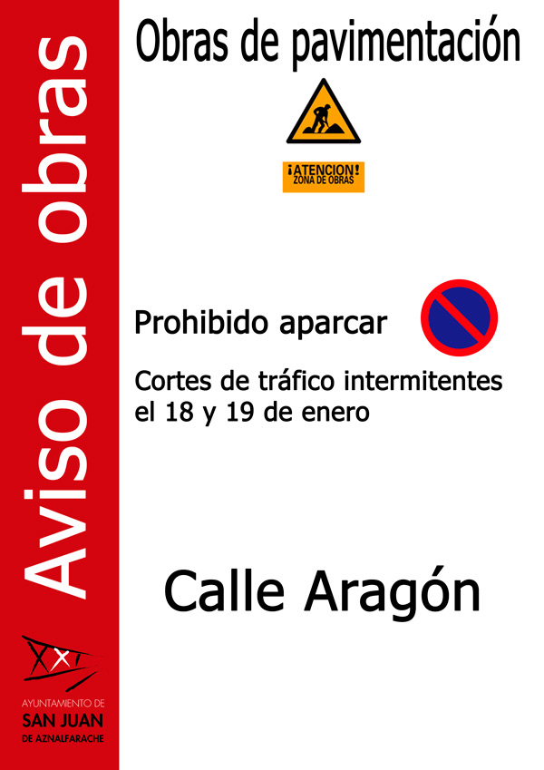 Del lunes 18 al miércoles20 de enero. Asfaltado de las calles Aragón, Almuñécar y Juan Ramón Jiménez. Se prohibe el estacionamiento y se producirán cortes intermitentes en el tráfico rodado.