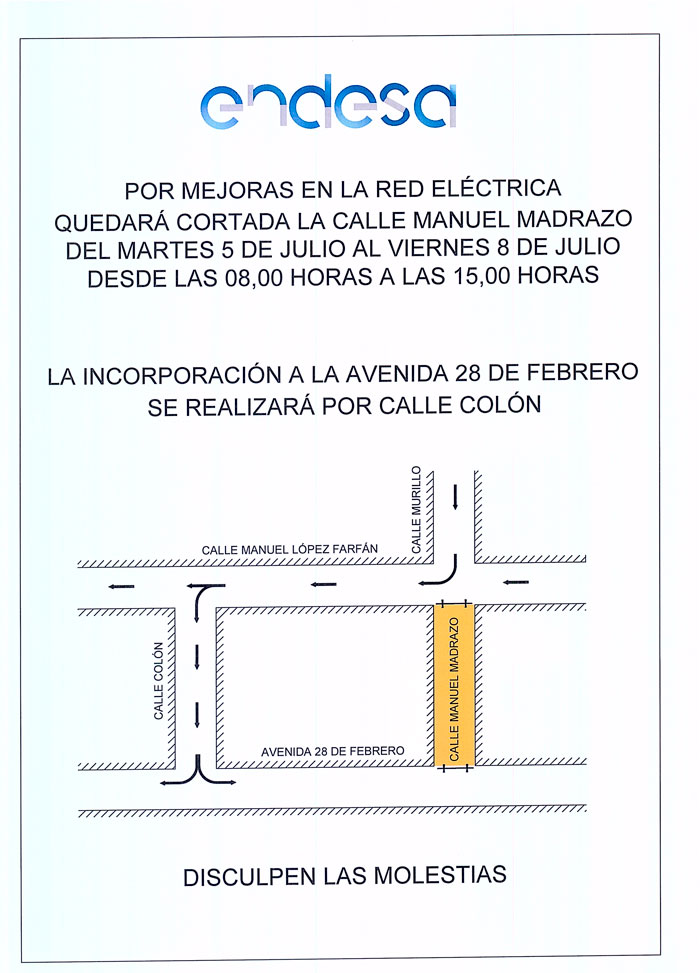 La compañía Endesa realizará obras de canalización eléctrica subterránea en la calle Manuel Madrazo entre los días 5 y 8 de julio próximo. Por este motivo la calle permanecerá cortada al tráfico de 7:30 a 15:00 horas. Durante las horas de corte de tráfico se habilitará una salida alternativa desde Manuel López Farfán hacia la Avenida 28 de febrero por la calle Colón. Se permitirá el giro a la izquierda en la avenida 28 de febrero..