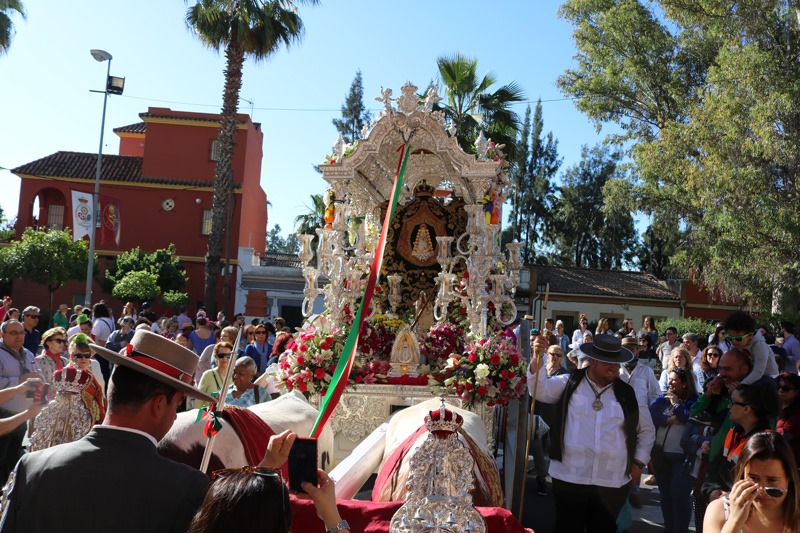 Minutos más tarde, sobre las 19:30 horas, será la Hermandad del Rocío de San Juan la que desde Mairena del Aljarafe entre en nuestro municipio a desde la Avenida de Mairena para discurrir por las calles Ávila, Burgos, Santander, Oviedo, Avenida de Palomares y Payán Garrido para entrar en la Iglesia de San José Obrero.