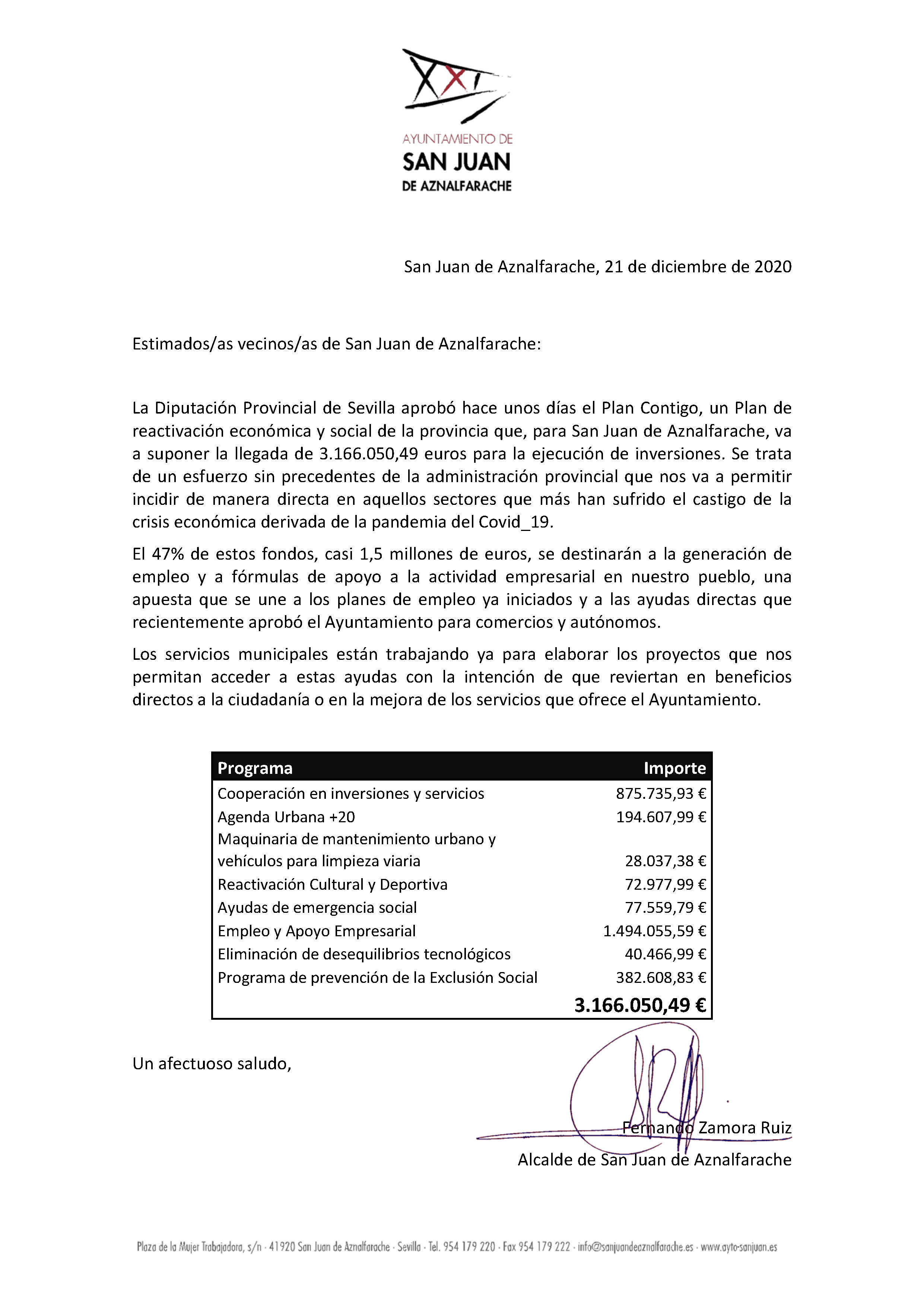 El alcalde de San Juan de Aznalfarache dirige una carta a la ciudadanía en la que informa de las líneas generales de la inversión del Plan Contigo de Diputación de Sevilla