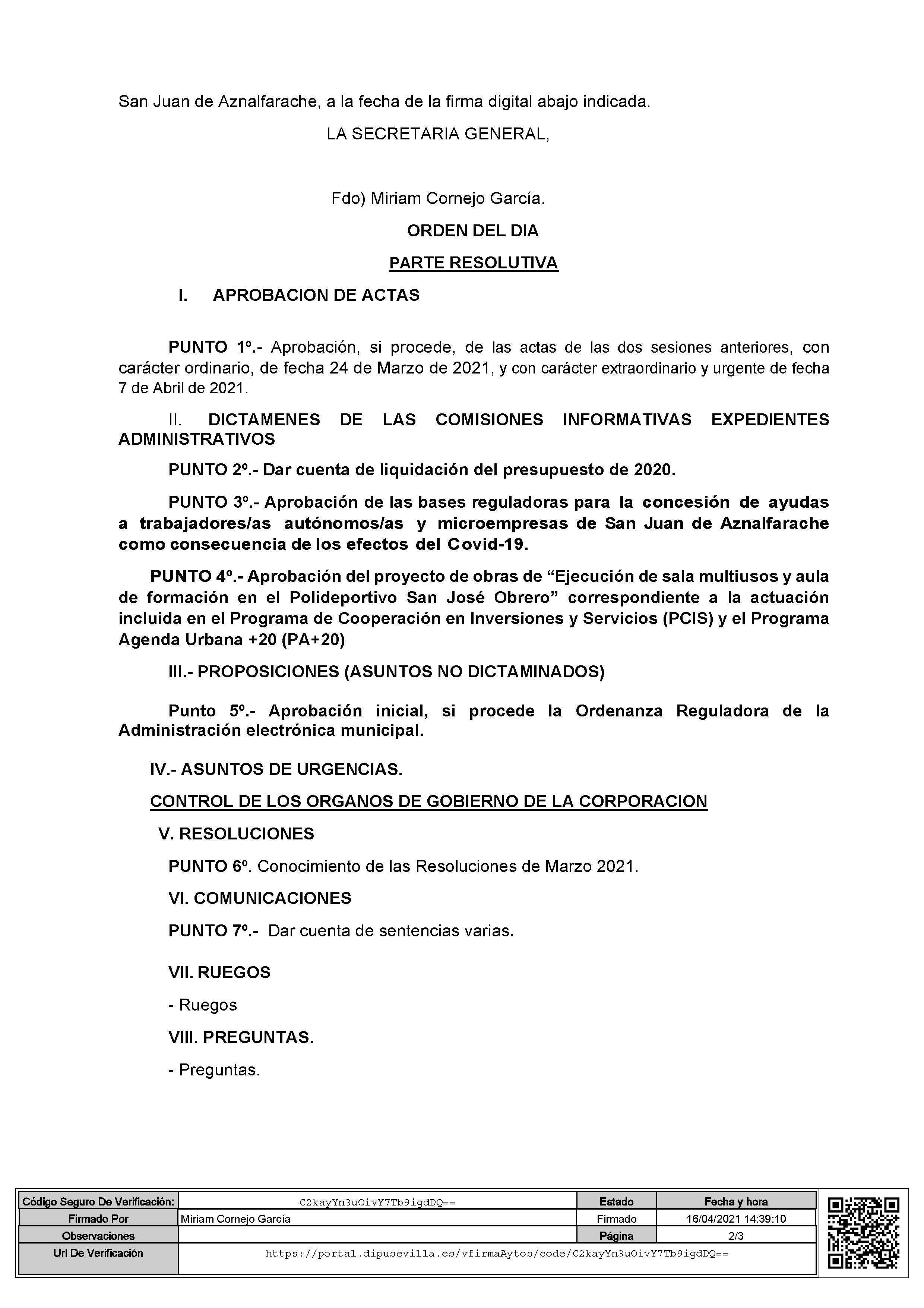 El Pleno se celebrará el miércoles 21 de abril a las 9.30 a través de videoconferencia con 7 puntos en el Orden del Día.