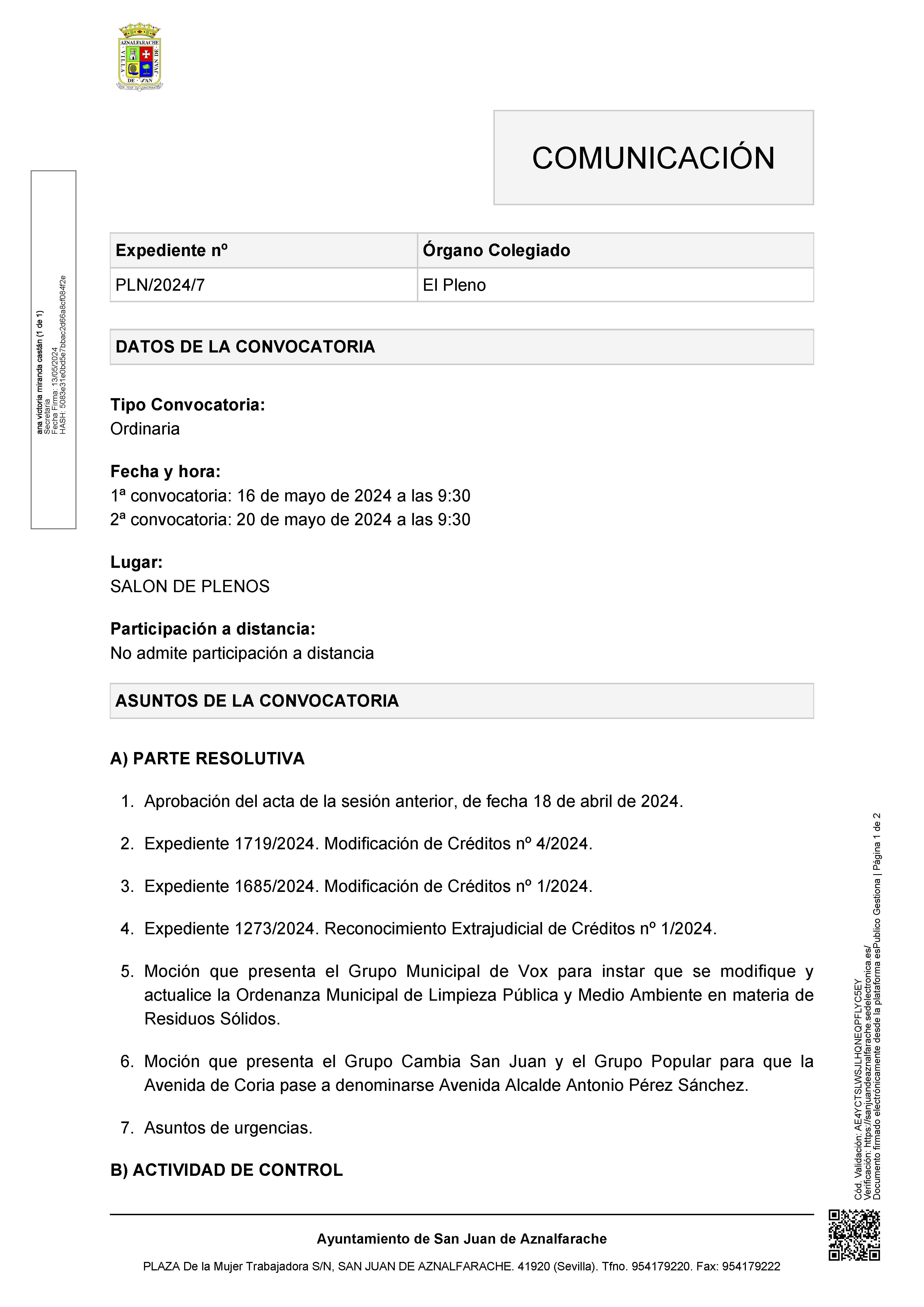 Convocatoria del pleno ordinario 16 05 2024