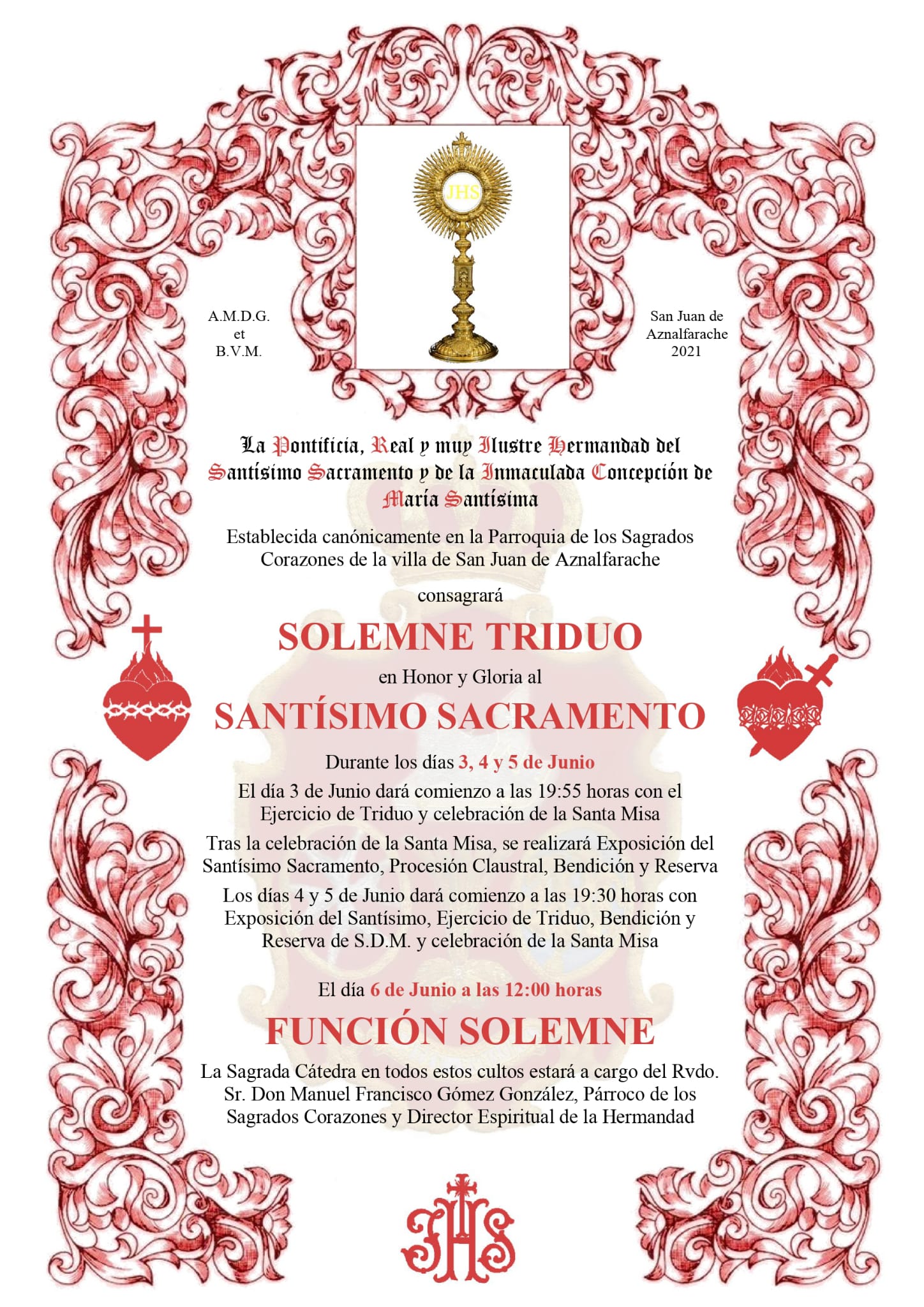 Del 3 al 5 de junio celebrará su tradicional triduo en honor al Santísimo Sacramento. El 6 de junio a las 12:00h el párroco de los Sagrados Corazones, D. Manuel Francisco Gómez, oficiará la Función Solemne de la hermandad.