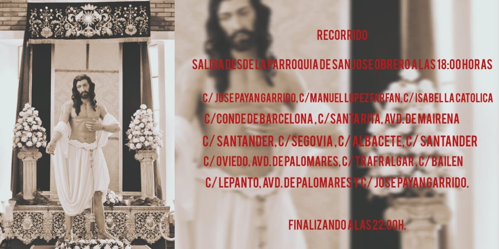 El próximo sábado 15 de Abril a las 18:00 horas la Hermandad Sacramental de San José Obrero sacará en procesión a su resucitado desde la Parroquia de San José Obrero