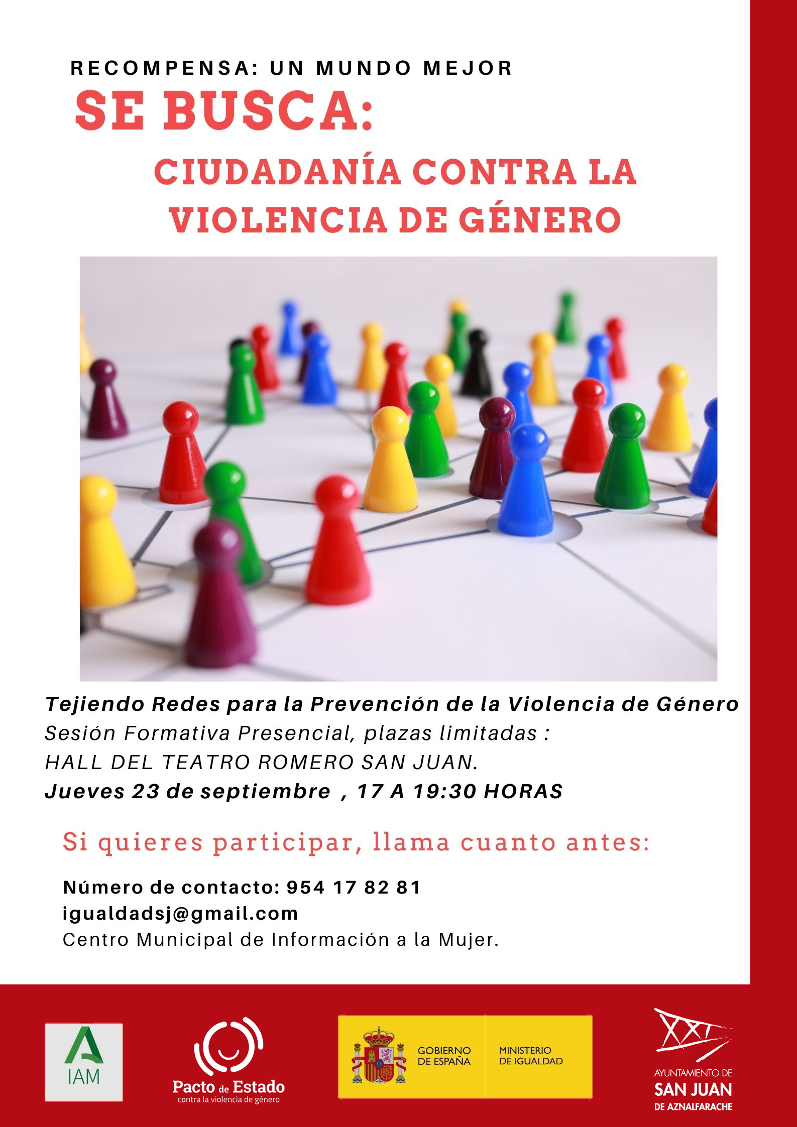 Con el nombre "Tejiendo redes para la prevención de la violencia de género", se busca alcanzar una recompensa, un mundo mejor para todos. Para participar en esta sesión es necesario inscribirse previamente llamando al teléfono 954 17 81 82 o bien remitiendo un email a igualdadsj@gmail.com. Las plazas son muy limitadas.