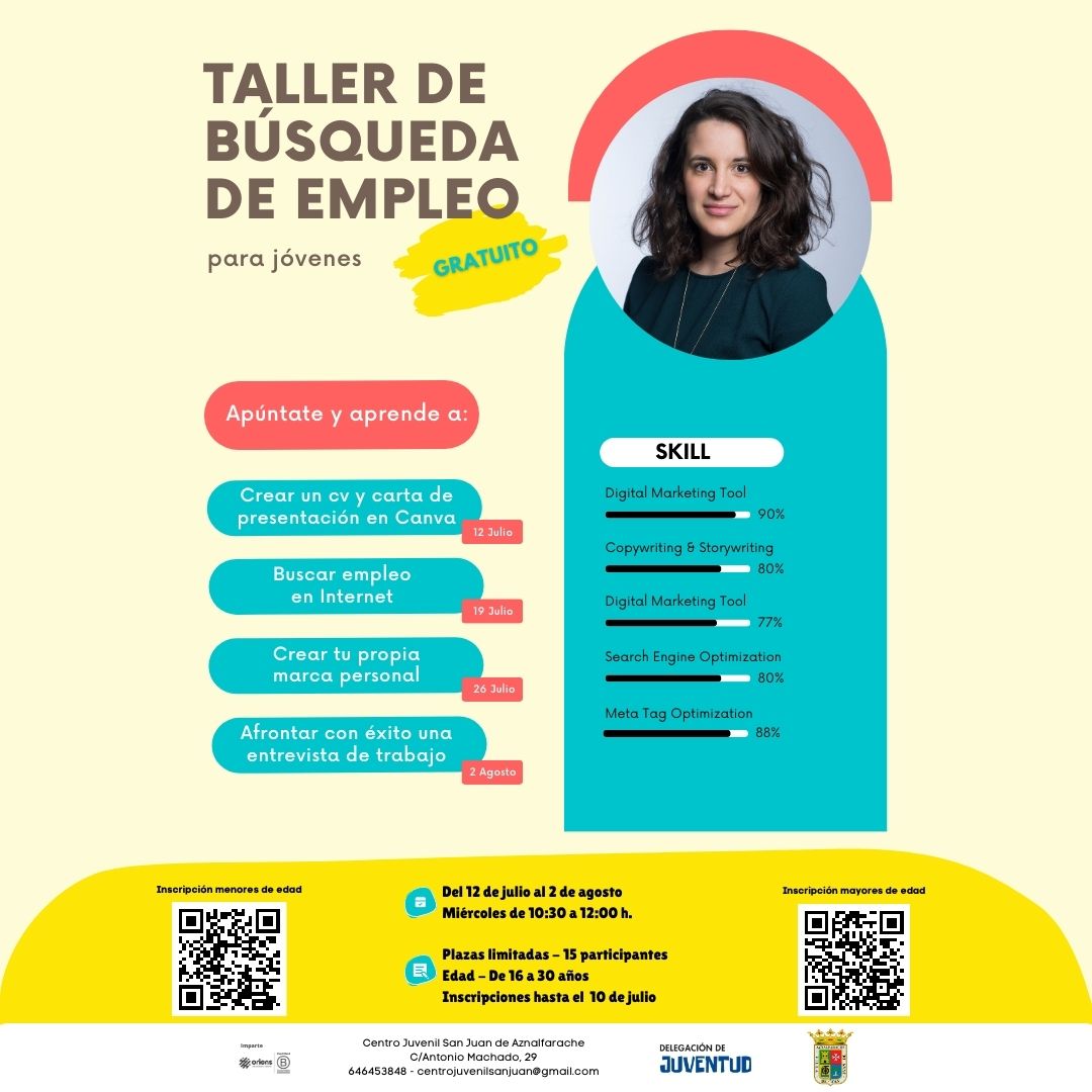 Queremos ofrecerte algunas herramientas básicas para afrontar el proceso de búsqueda de empleo. Dividimos el contenido en los cuatro días de duración de este Taller de búsqueda de empleo para jóvenes. El primer paso es realizar la inscripción, que se puede realizar online. El taller comienza el 12 de julio y termina el 2 de agosto y se realizará los miércoles por la mañana de 10:30 a 12:00 horas.