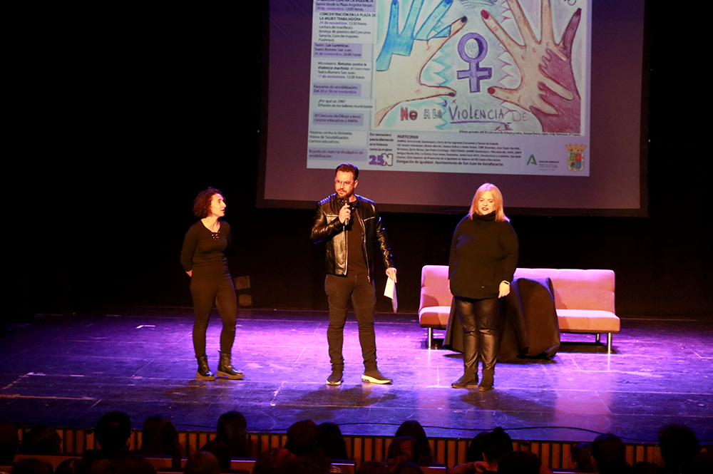 Un canto inclusivo, con lenguaje de signos, y tres piezas de microteatro han abierto el calendario de actividades programadas con motivo del Día Internacional para la eliminación de la Violencia contra las Mujeres. El alumnado los ciclos del IES Sotero Hernández organizó esta actividad en el Teatro Romero San Juan a la que asistió alumnado de los Centros de Secundaria de la localidad.